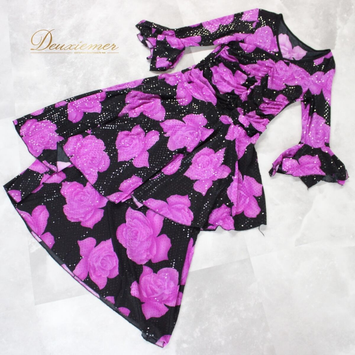 #社交ダンス衣装 #ダンスドレス #花柄ドレス #ブラックドレス #パープルドレス #フレアドレス #華やかデザイン #ステージ映え #大人可愛い #レディースドレス #優雅なシルエット #レッスン着 #ダンスウェア #ダンス衣装 #ダンスコスチューム #ステージ衣装 #古着 #中古 #ENUTSU