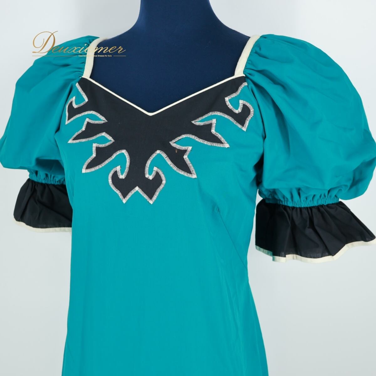 #フラダンス #ワンピースドレス #グリーンコーデ #ブラックスタイル #パフスリーブ #半袖ドレス #ハワイアンファッション #アロハコーデ #絞りデザイン #華やか #南国スタイル #リゾートファッション #可愛い衣装 #ダンス衣装 #ダンスコスチューム #ステージ衣装 #古着 #中古 #ENUTSU