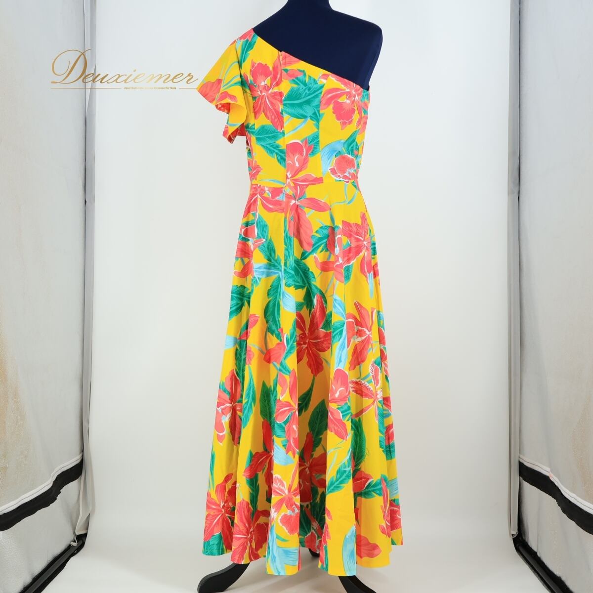 【美品 日本製 フラダンス衣装】イエロー Paondor パンドール ワンピース ドレス 黄 赤 緑 花柄 ワンショルダー 鮮やか レッド