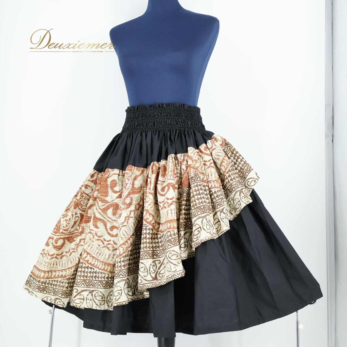 【美品 フラダンス衣装】ブラック パウスカート 黒 茶 ベージュ ふんわり ハワイアンプリント シャーリング アロハ かわいい