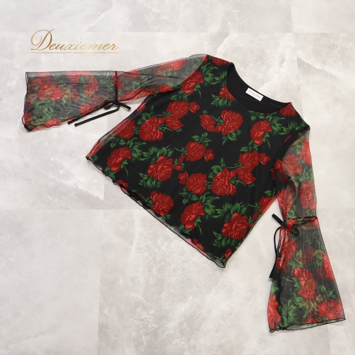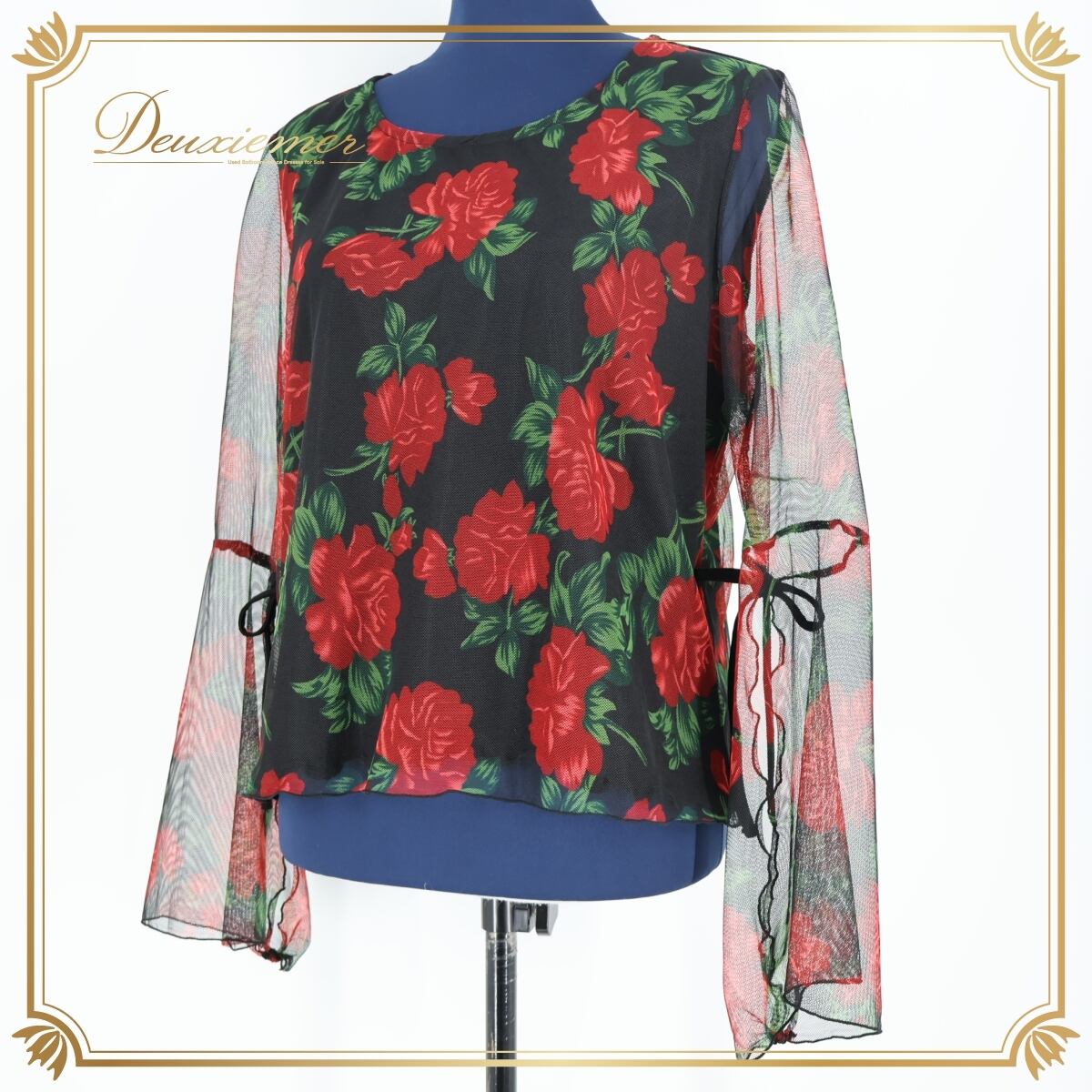 #社交ダンス #ダンストップス #ブラックコーデ #レッドアクセント #花柄デザイン #透け感素材 #長袖ブラウス #レッスンウェア #ストレッチ素材 #上品スタイル #Solegrido #華やかコーデ #エレガントファッション #ダンス衣装 #ダンスコスチューム #ステージ衣装 #古着 #中古 #ENUTSU