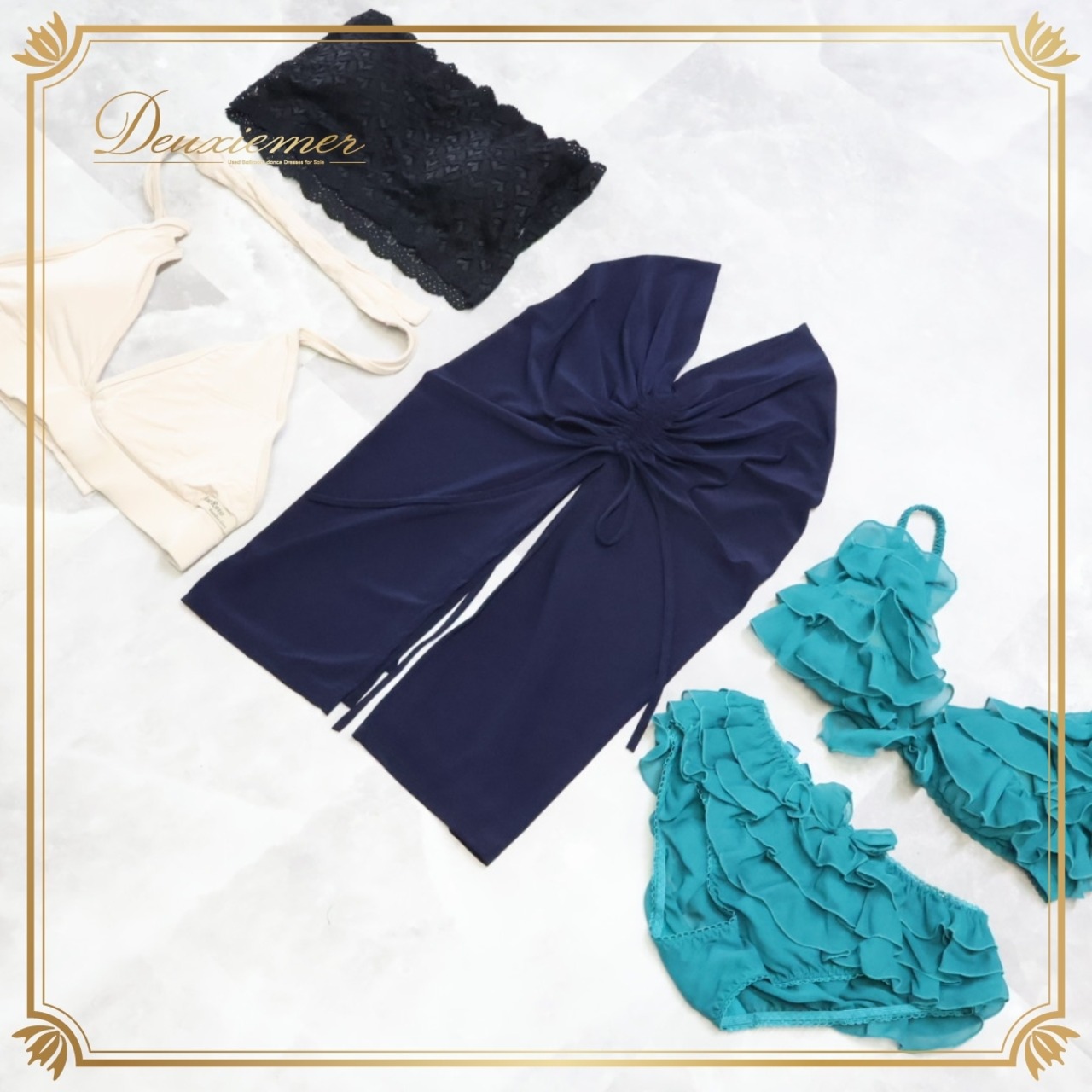 【ダンス衣装 まとめ売り】全5点 セット トップス 黒 アイボリー 紺 エメラルドグリーン レース フリル リボン 伸縮 柄 無地 ダンス コスチューム スタイリッシュ おしゃれ パフォーマンス 伸縮性 エメラルドグリーンセット セットアップ タグ付き