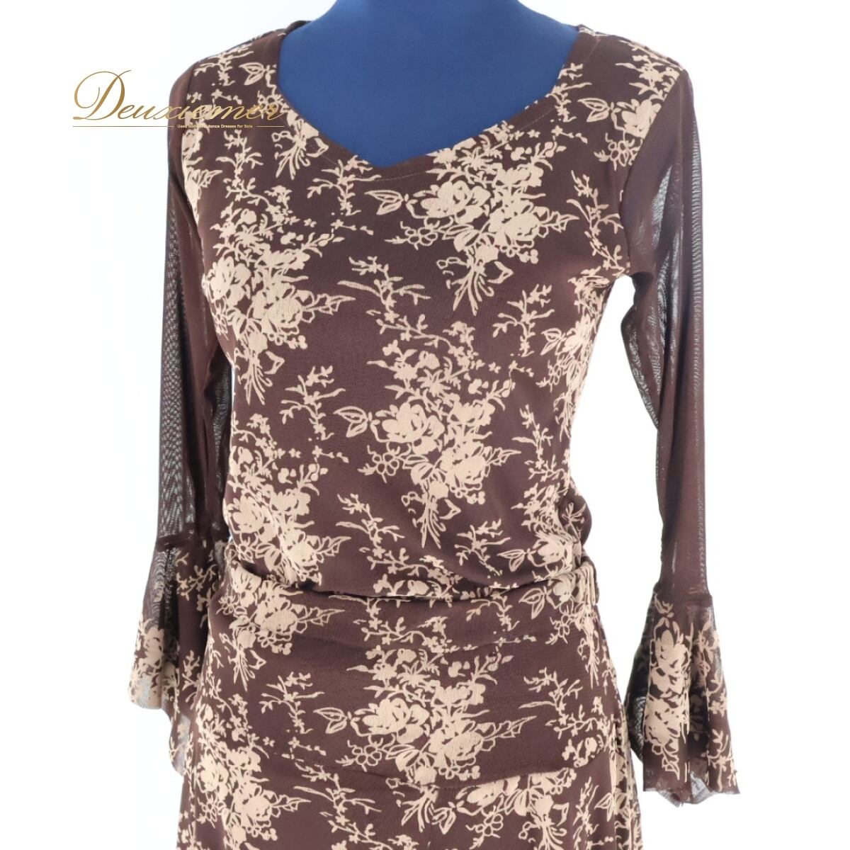 #社交ダンス #社交ダンス衣装 #ダンス上下セット #ブラウントップス #ブラウンスカート #茶色コーデ #花柄デザイン #フリル付き #レース生地 #ラメ入り #練習着 #レッスンウェア #華やかスタイル #大人っぽい #落ち着いたカラー #美品 #上品ファッション #映える衣装 #ダンス衣装 #ダンスコスチューム #ステージ衣装 #古着 #中古 #ENUTSU