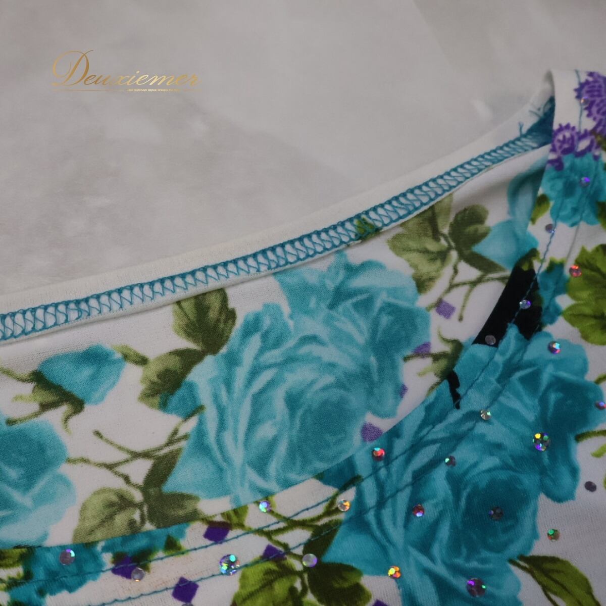 #社交ダンス #社交ダンス衣装 #ダンス上下セット #水色トップス #ホワイトコーデ #レッスンウェア #練習着 #花柄デザイン #レース生地 #ラメ入り #爽やかスタイル #上品コーデ #紫アクセント #黒アクセント #柄トップス #模様入り #大人ダンス #ダンス衣装 #ダンスコスチューム #ステージ衣装 #古着 #中古 #ENUTSU