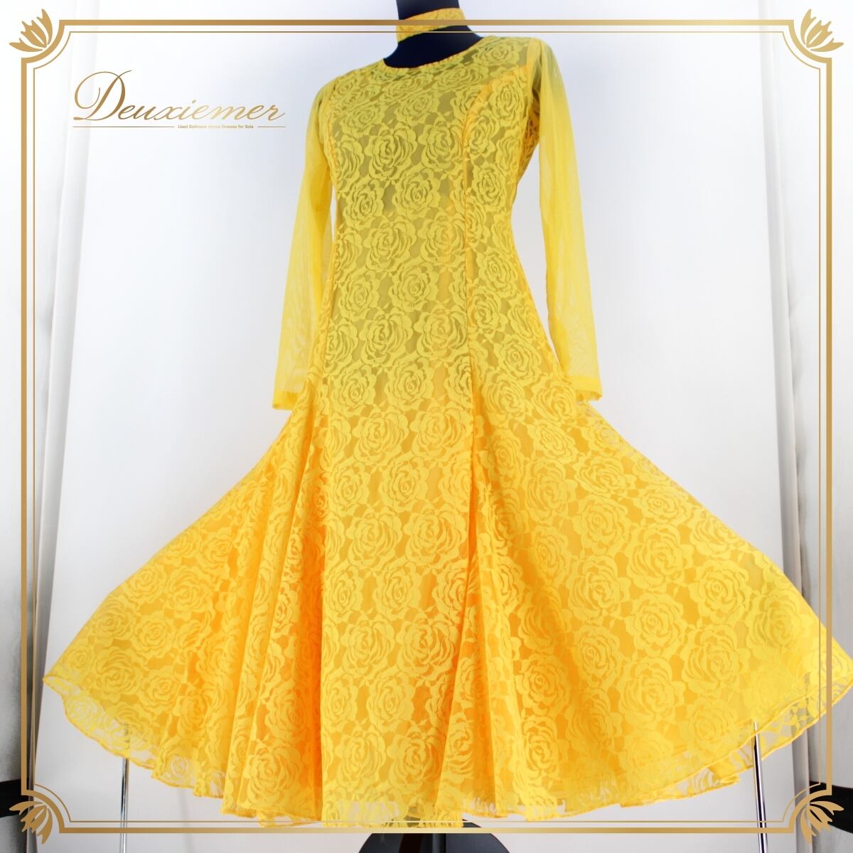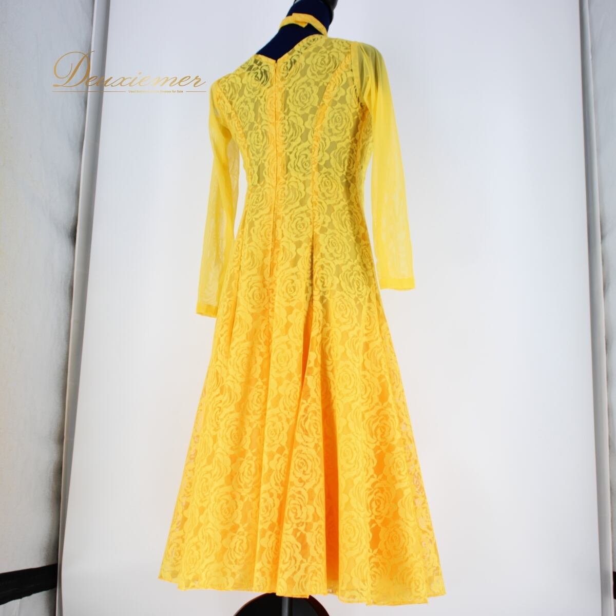 【美品 社交ダンス衣装】ワンピース ドレス 黄色 イエロー 花柄 レース チョーカー 長袖 華やか 派手 目立つ 清楚 上品 気品