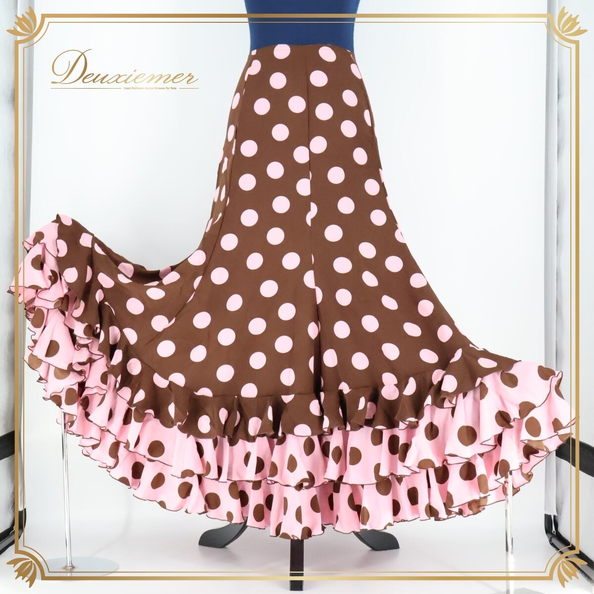 【美品 フラメンコ衣装】ブラウン HERMOSA IBERIA エルモサイベリア ファルダ スカート ボランテ 茶色 ピンク ドット 水玉