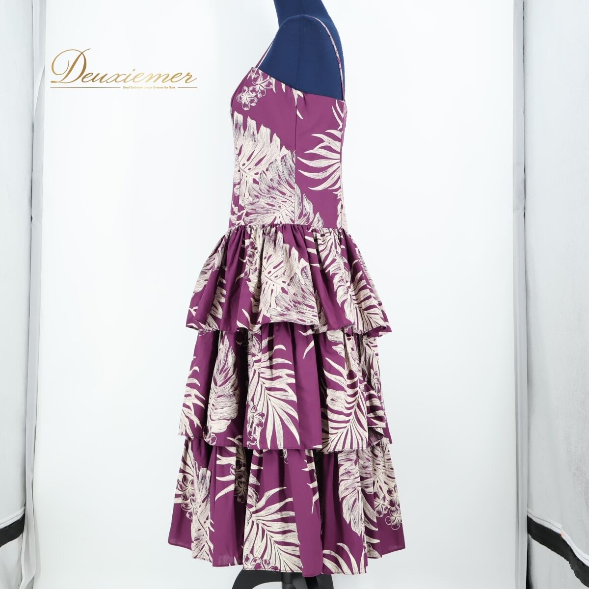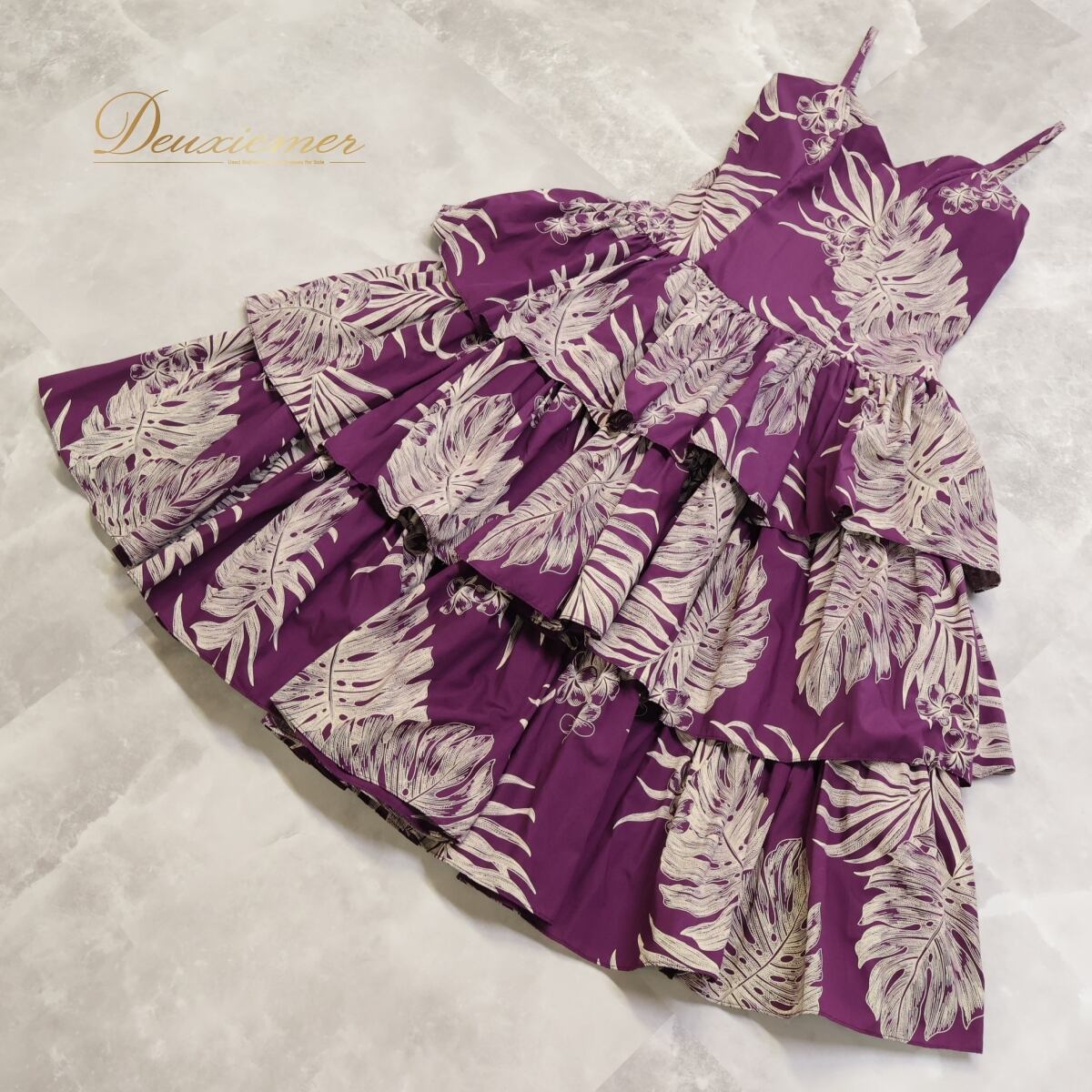 【ハワイ製 フラダンス衣装】パープル CC Fashions ワンピース ドレス 紫 白 プルメリア柄 モンステラ柄 フリル キャミソール