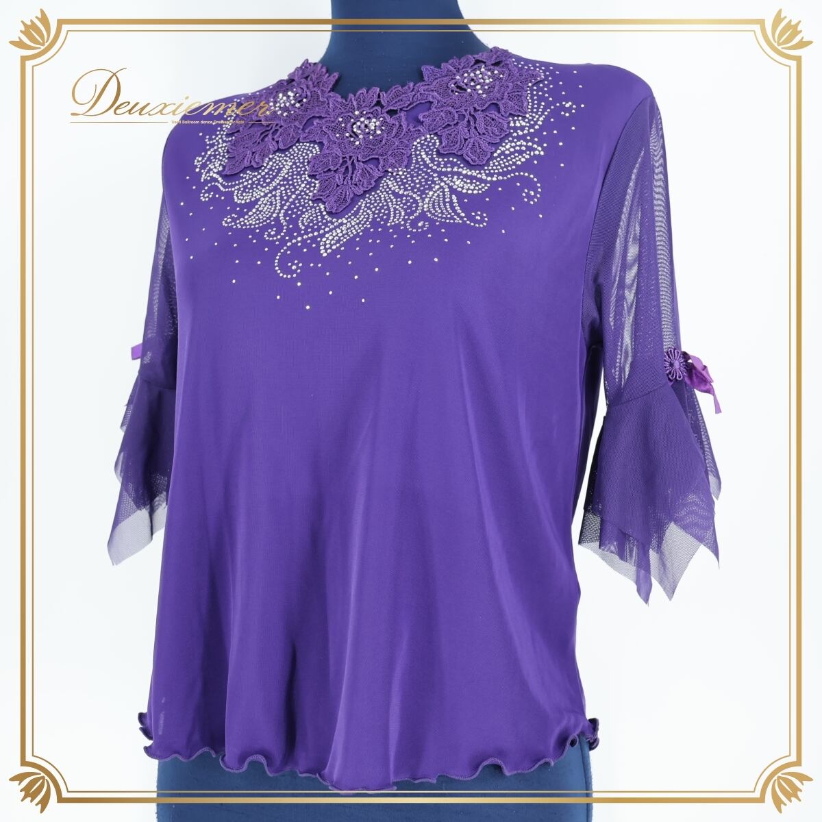 【社交ダンス衣装】パープル PYRAMID ピラミッド トップス ブラウス 紫 ラインストーン 花 刺繍 レッスン 練習着 ストレッチ