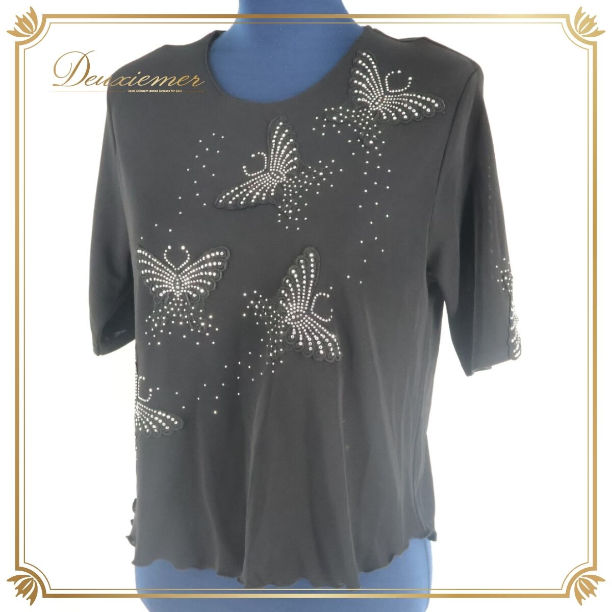【美品 社交ダンス衣装】ブラック ピラミッド トップス ブラウス ラインストーン 蝶 ラメ 黒 柄 模様 レース生地 レッスン着