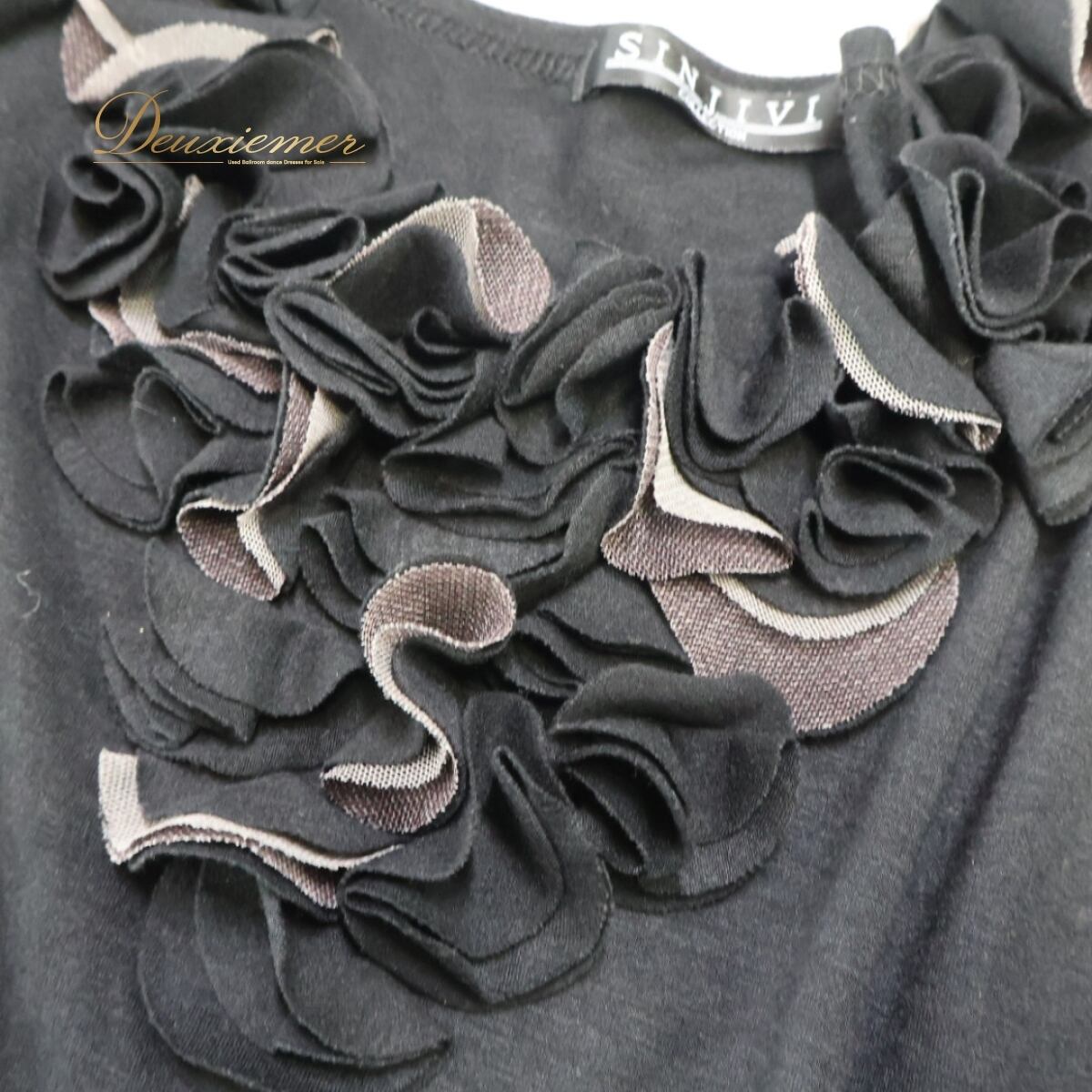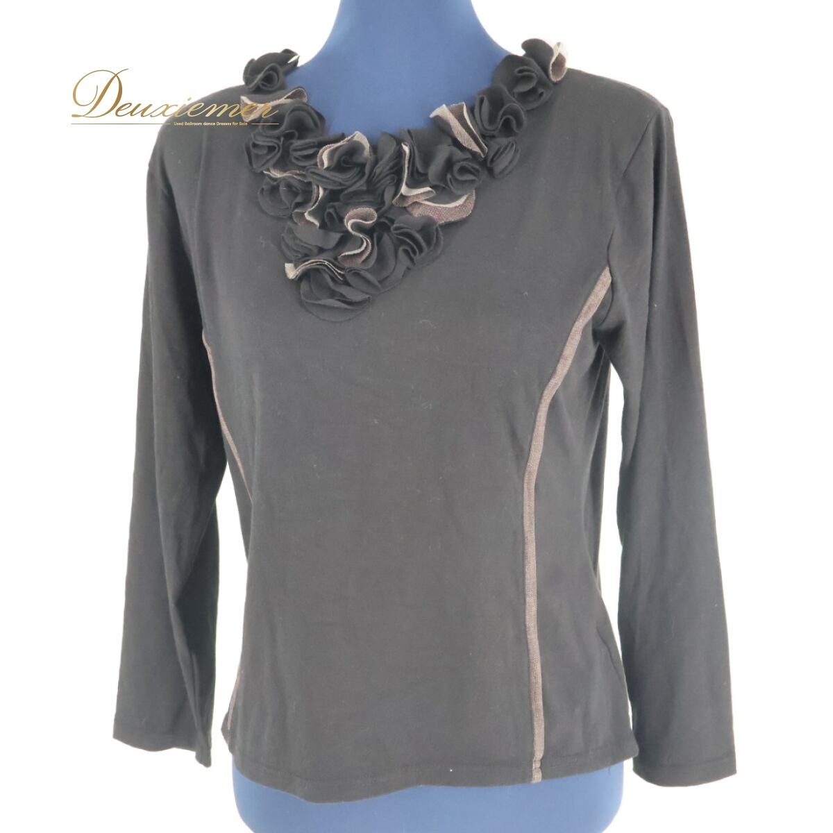 #社交ダンス衣装 #ブラックトップス #SINJIVI #フリルトップス #伸縮素材 #おしゃれダンス着 #茶色アクセント #練習着 #レッスンウェア #豪華デザイン #首元フリル #美品トップス #ダンスファッション #エレガントスタイル #ダンスウェア #ダンス衣装通販 #ダンス衣装 #ダンスコスチューム #ステージ衣装 #古着 #中古 #ENUTSU