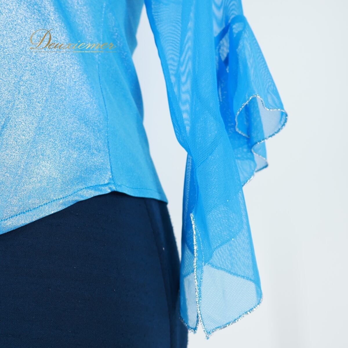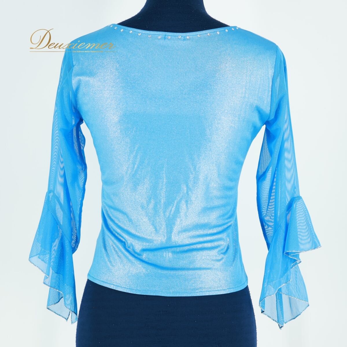 【社交ダンス衣装】スカイブルー エル・プラト トップス ブラウス 水色 ラインストーン フリル 透け感 レッスン 練習着 可愛い