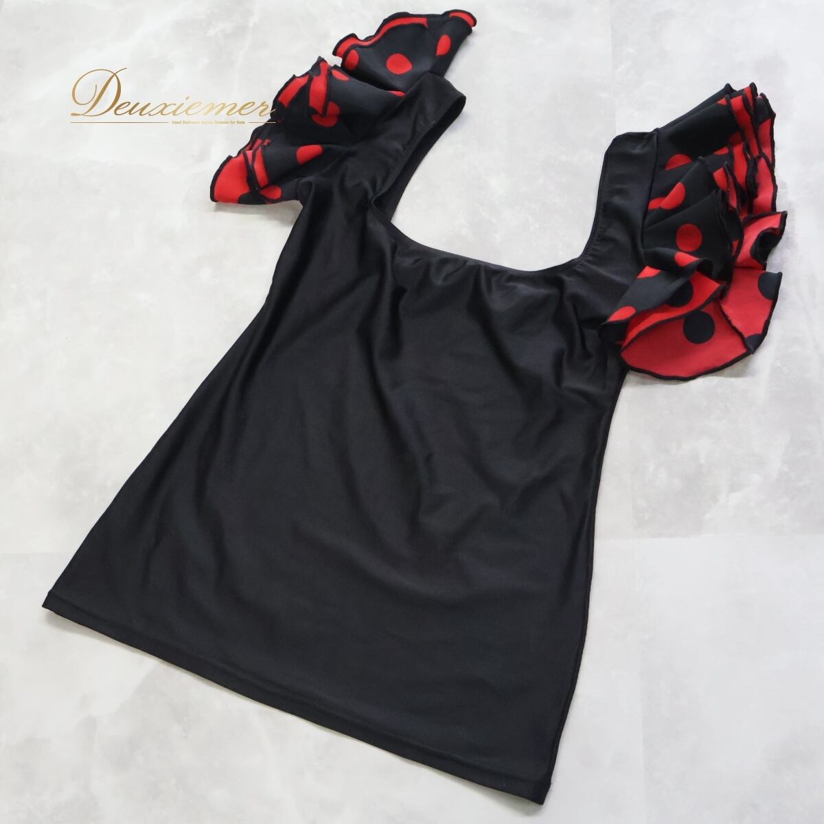 #フラメンコ衣装 #ノースリーブ #ドット柄 #赤黒コーデ #フリルトップス #ダンストップス #フラメンコファッション #伸縮素材 #レッスン着 #ステージ衣装 #可愛いデザイン #エレガントスタイル #動きやすい服 #華やか衣装 #ブラウス #ポップカラー #舞台衣装 #ダンス衣装 #ダンスコスチューム #古着 #中古 #ENUTSU