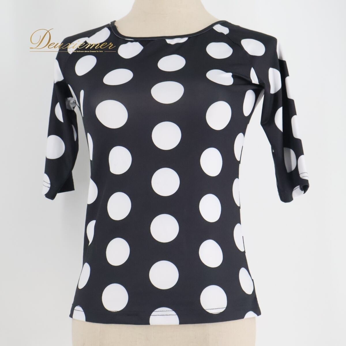 【フラメンコ衣装】ブラック ブラウス トップス カットソー 黒 白 ドット 水玉 柄 伸縮 ストレッチ ダンス レッスン 練習