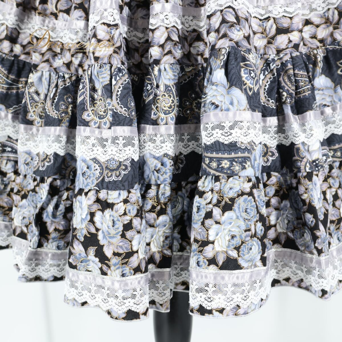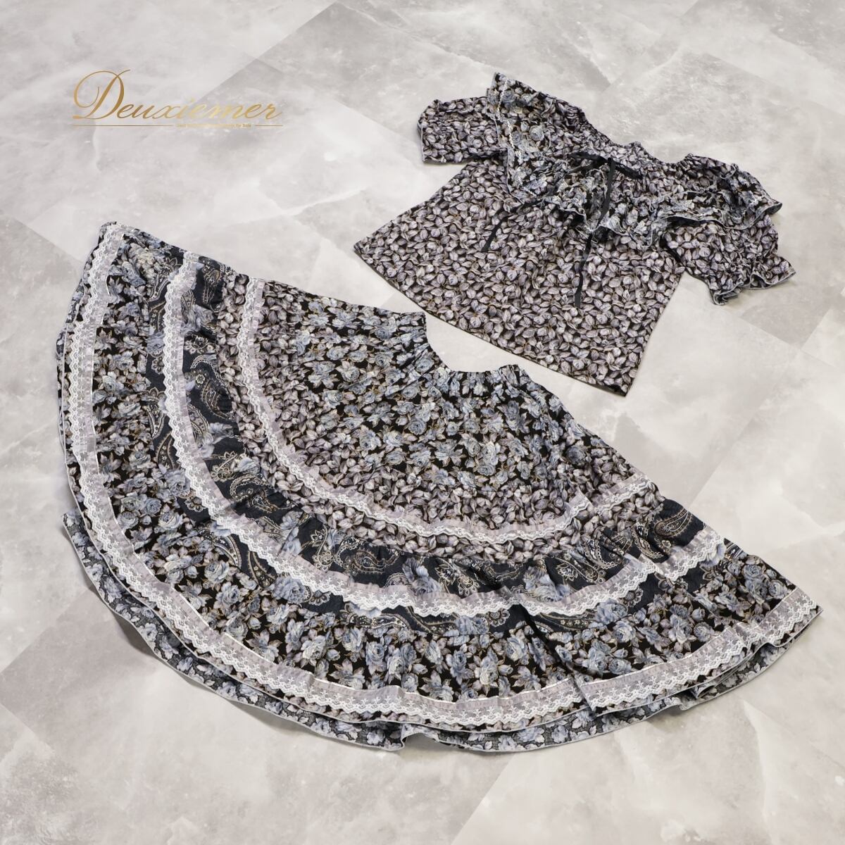 【フォークダンス衣装】ブラック MONDIKI 上下セット ツーピース セットアップ 黒 青 白 花柄 ペイズリー柄 レース フリル