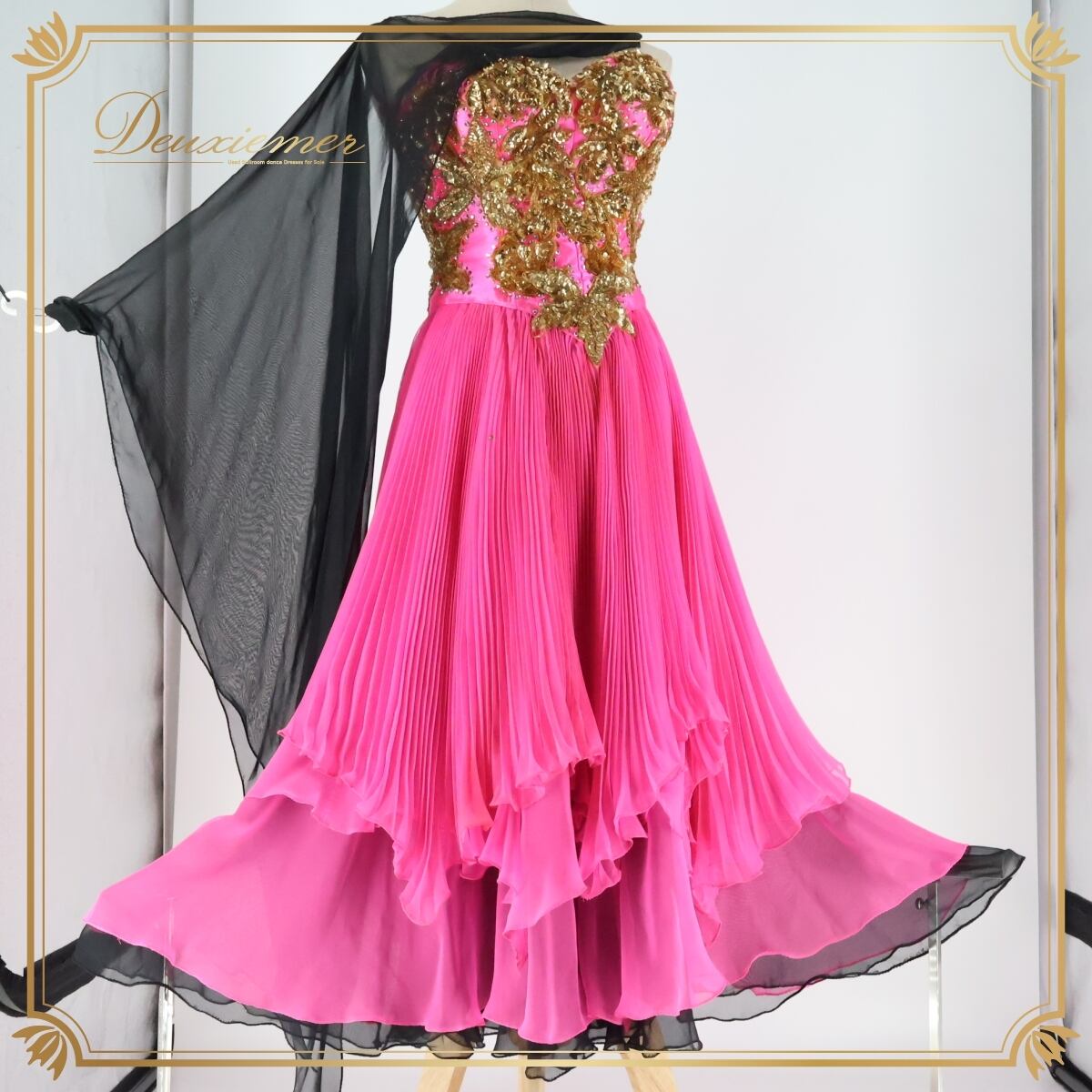 【社交ダンス衣装】ピンク ワンピース ドレス ブラック 黒 プリーツ ダンス デモ 競技用 フロート レース 綺麗 上品 金 ゴールド ショート丈 おしゃれ レディース 舞台衣装 発表会