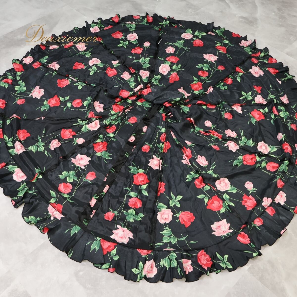 【フラメンコ衣装】ブラック ファルダ スカート ボウタイ 黒 赤 ピンク 緑 花柄 シージョ 軽い 光沢 鮮やか フリル 大きめ