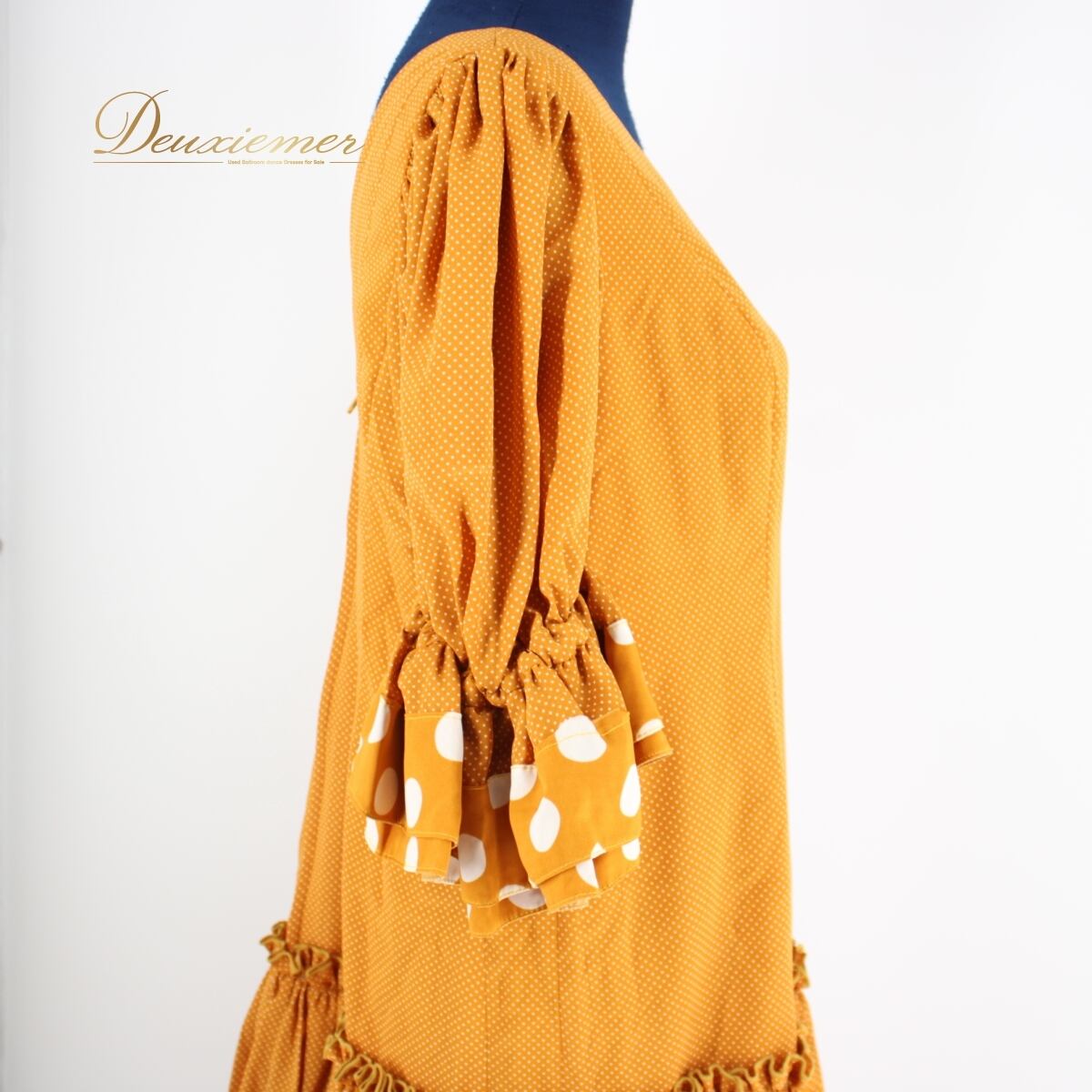 【美品 フラメンコ衣装】ワンピース ドレス オーカー 金茶 白 ホワイト オレンジ ドット マルチドット 水玉 ボランテ フリル