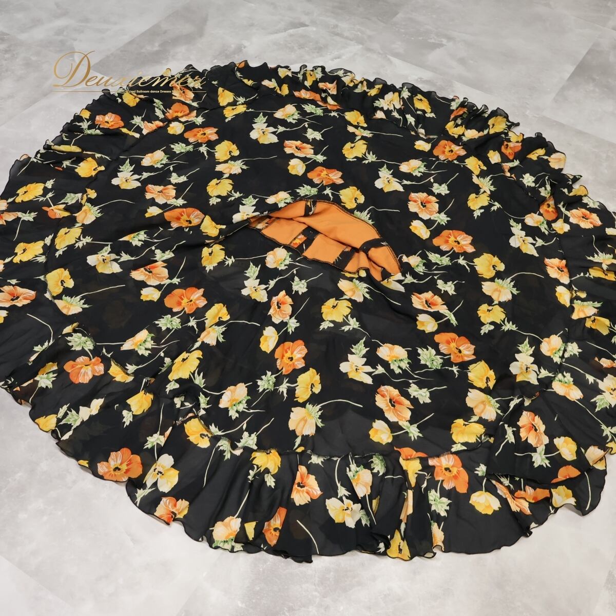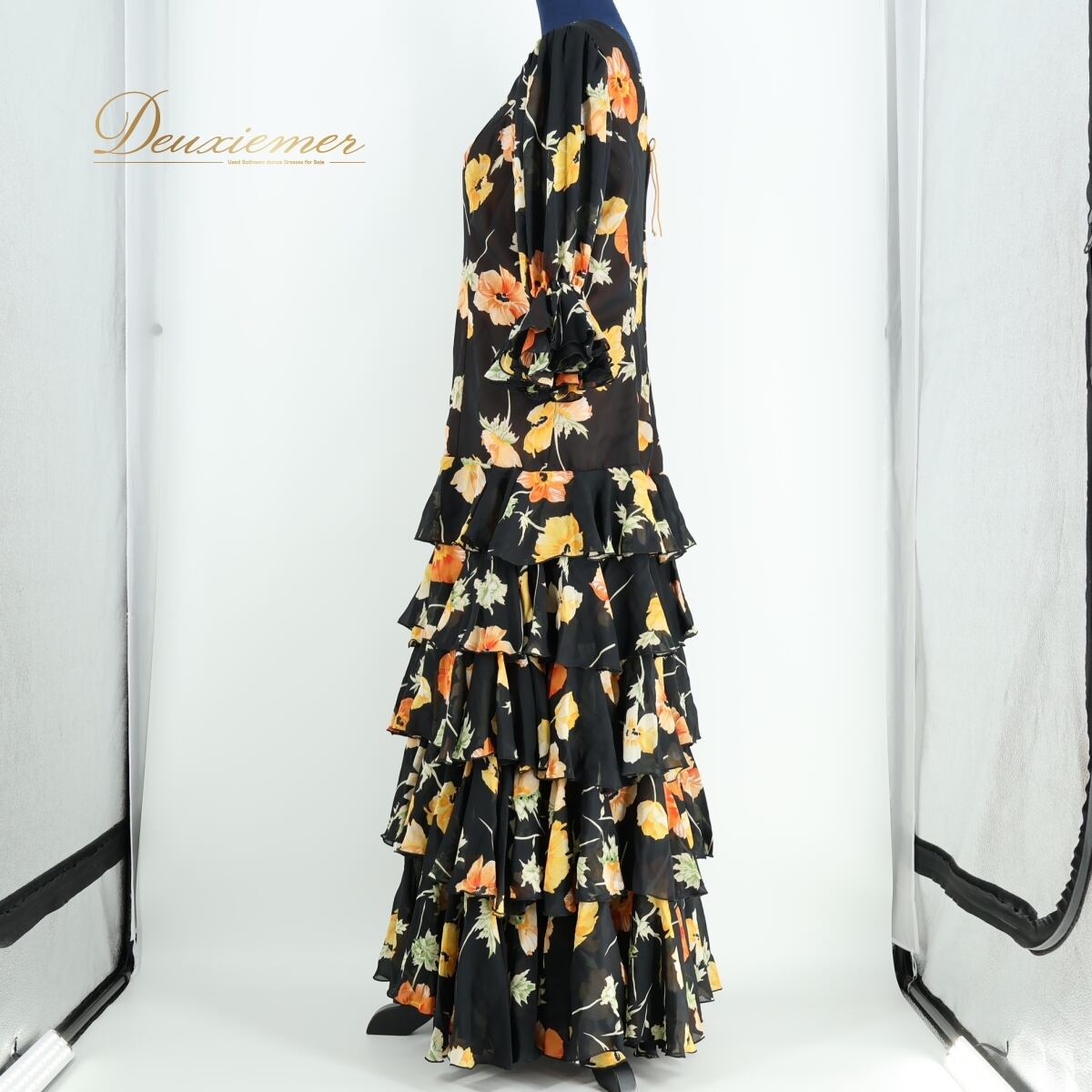 #フラメンコ衣装 #ソニアジョーンズ #花柄ドレス #段々ボランテ #ボリュームワンピース #鮮やかカラー #ブラックコーデ #オレンジアクセント #イエローポイント #華やかスタイル #上品ドレス #舞台映え #ダンス衣装 #ダンスコスチューム #ステージ衣装 #古着 #中古 #ENUTSU