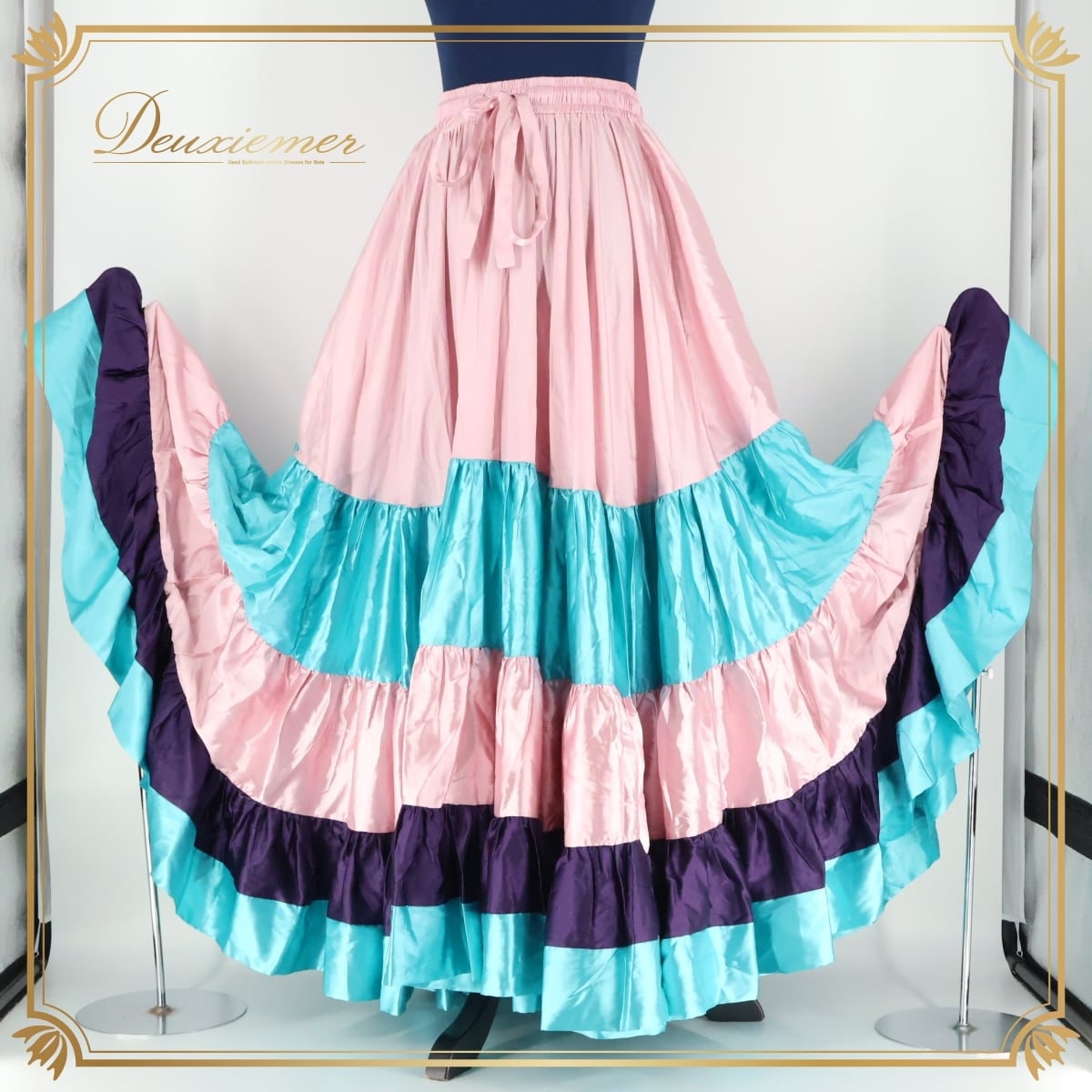【ベリーダンス用衣装】ピンク 水色 パープル ジプシースカート ロング ボリューム 5段フリル 大きく広がる裾 女性らしい かわいい 伸縮性 ウエストゴム ファスナー仕様 大きいサイズ おしゃれ トルソーサイズ レディース フリル スカート 踊る