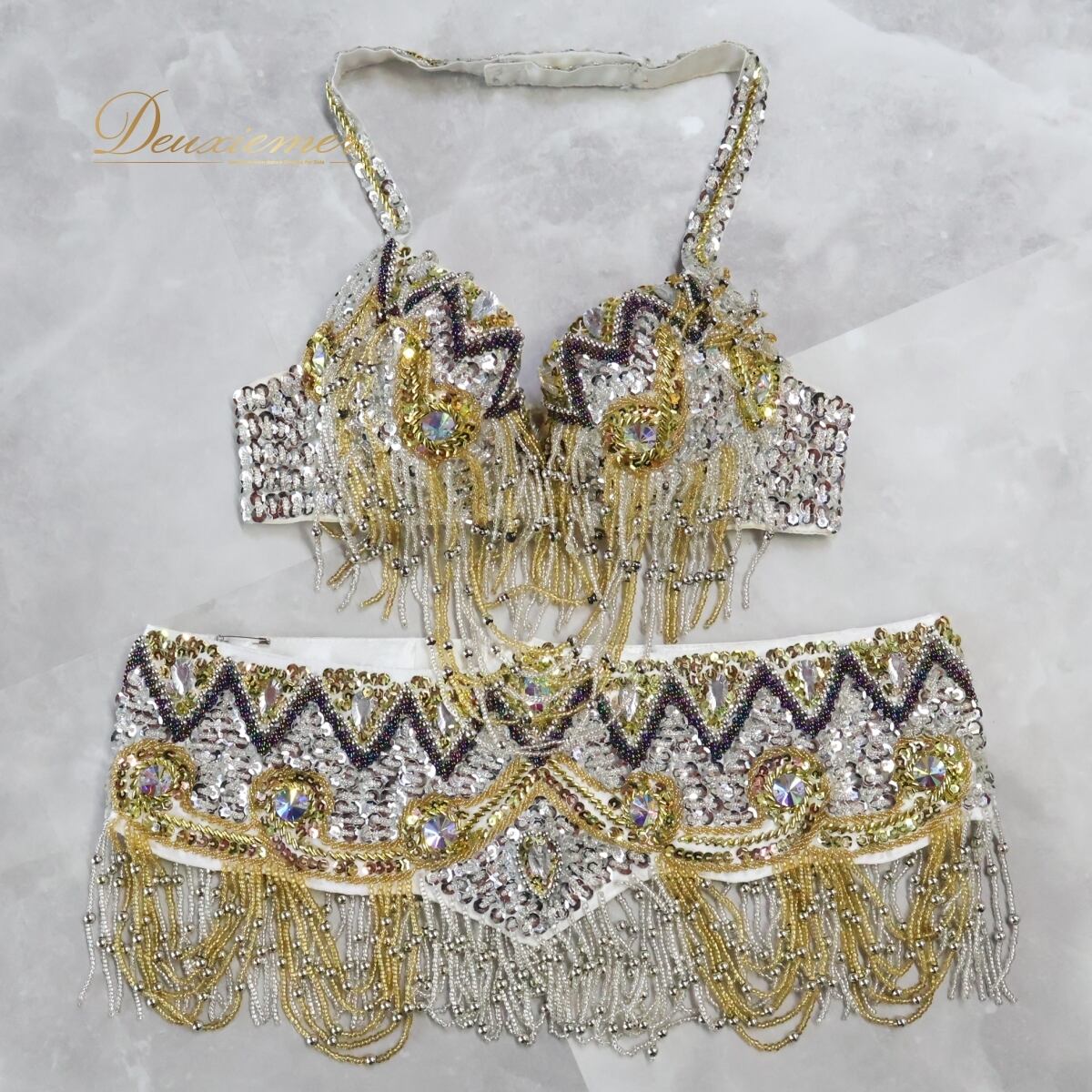 【ベリーダンス用 オリエンタル衣装】シルバー ゴールド スパンコールラメ ビーズ 装飾 2点セット ラメ 煌びやか アンダーストラップ 伸縮性 ベルト マジックテープ セット トップス 豪華 女性用 ゴージャス おしゃれ