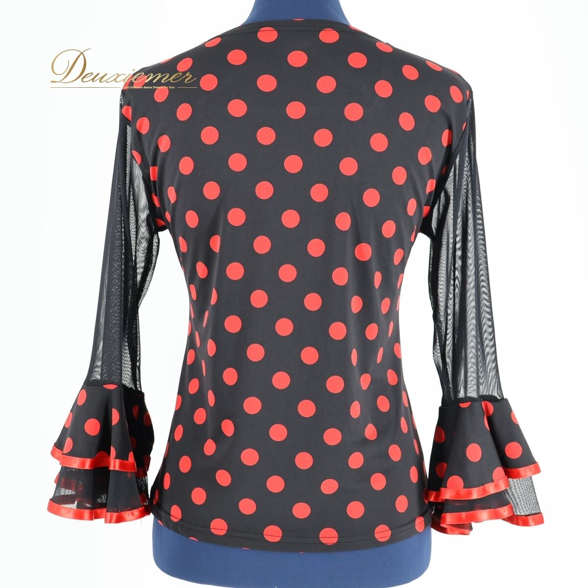 【フラメンコ衣装】ブラック T&Y トップス ブラウス 黒 赤 ドット 水玉 鮮やか フリル 透け感 レッド リボン かわいい 上品