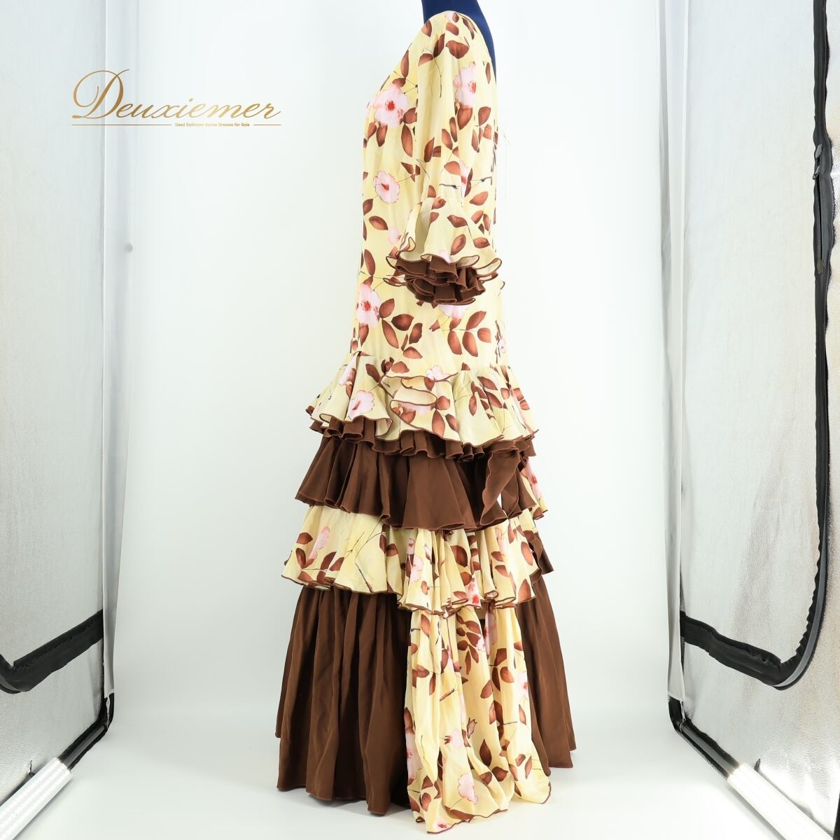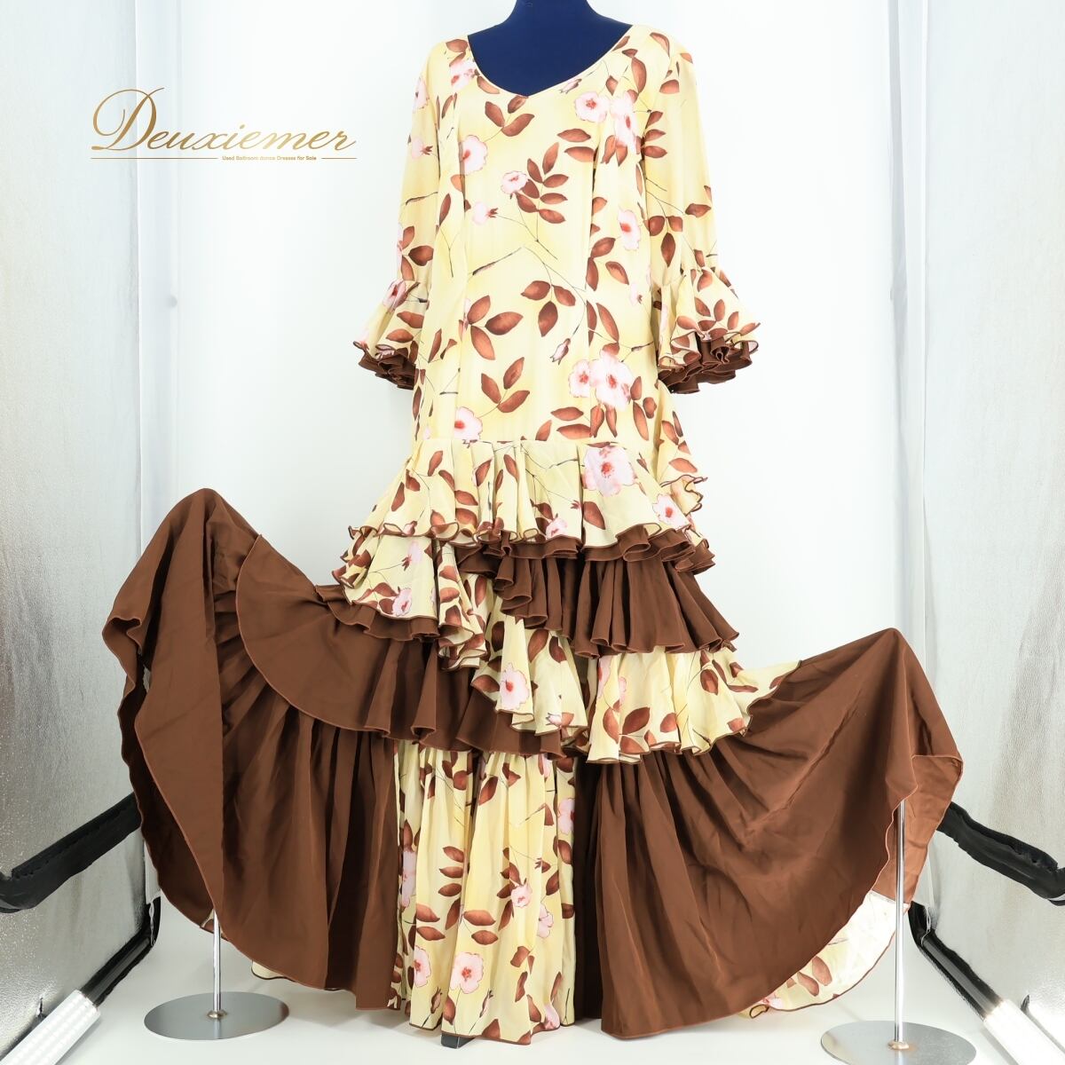 【フラメンコ衣装】イエロー ワンピース ドレス シージョ 黄 茶 ピンク ボランテ 淡い 花柄 長袖 ブラウン 大きめ 上品 可愛い