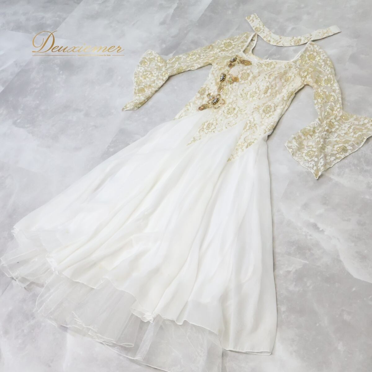 【社交ダンス衣装】ホワイト leirena レイリーナ ワンピース ドレス 白 ゴールド 金 レース フリル 軽い 薄い 高級感 上品 スタイリッシュ 舞台 イベント レディース