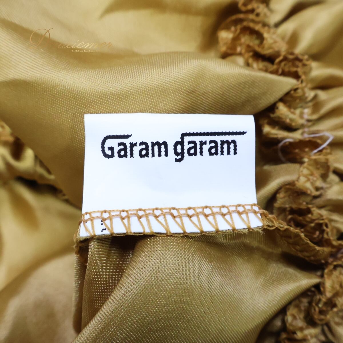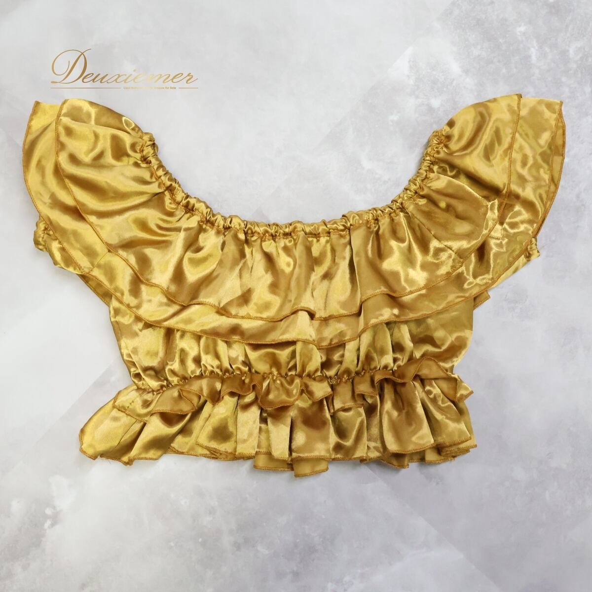 【ベリーダンス用衣装】ゴールド Garam garam トップス 半袖 黄土色 サテン レッスン着 伸縮 フリル 練習着 かわいい ショート丈 伸縮性 フリル豪華