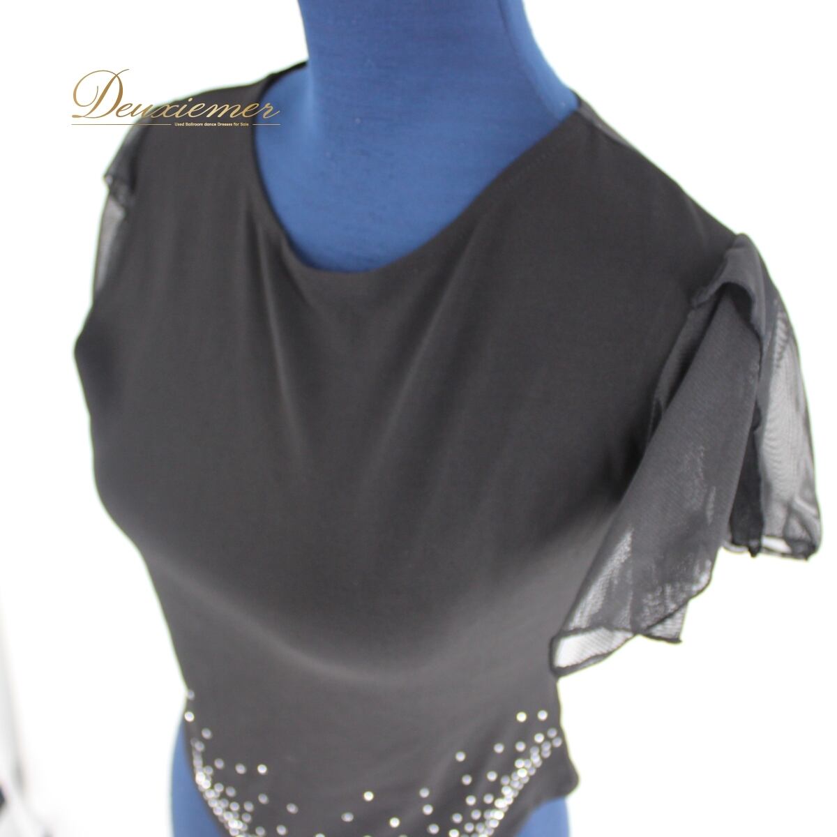 【美品 社交ダンス衣装】ブラック系 トップス レッスン パーティー solo ラインストーン 半袖 透け感 レース シンプル