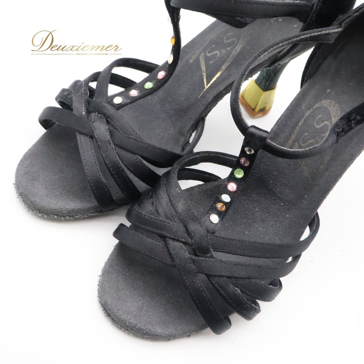 【社交ダンス用衣装】22 1/2CM ブラック系 サテン ラインストーン ダンス シューズ 黒 レディース用 靴 ヒール ベルト 大人っぽい ダンスシューズ サテンシューズ ブラックヒール 社交ダンス衣装 レディース靴 オシャレ ラインストーン付き 大人っぽい