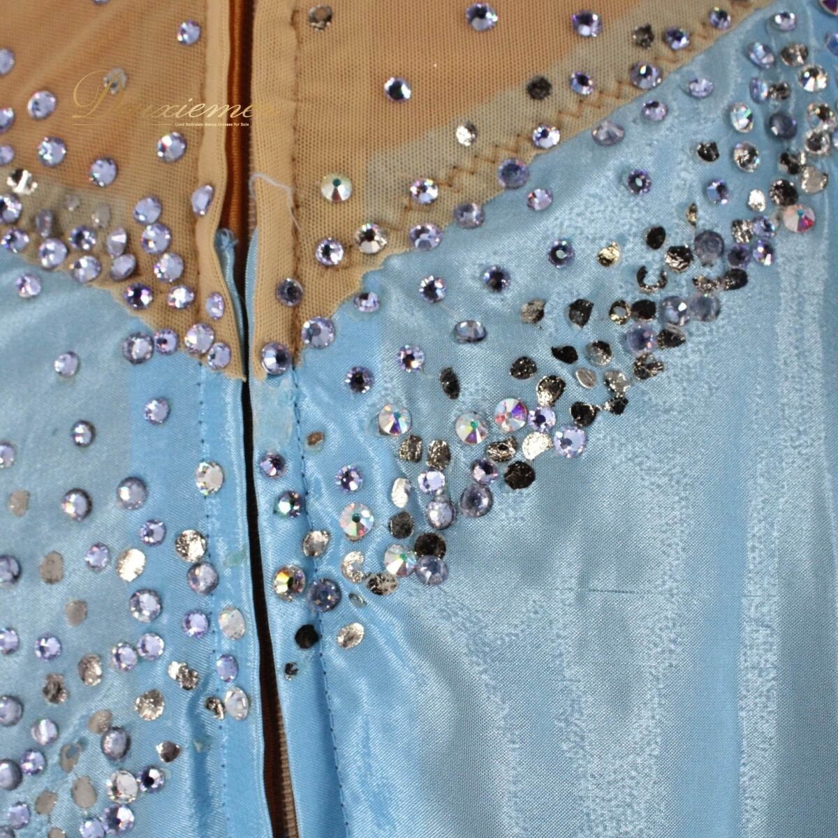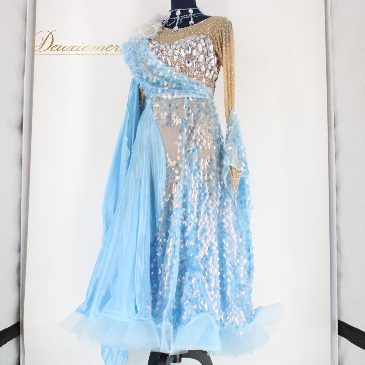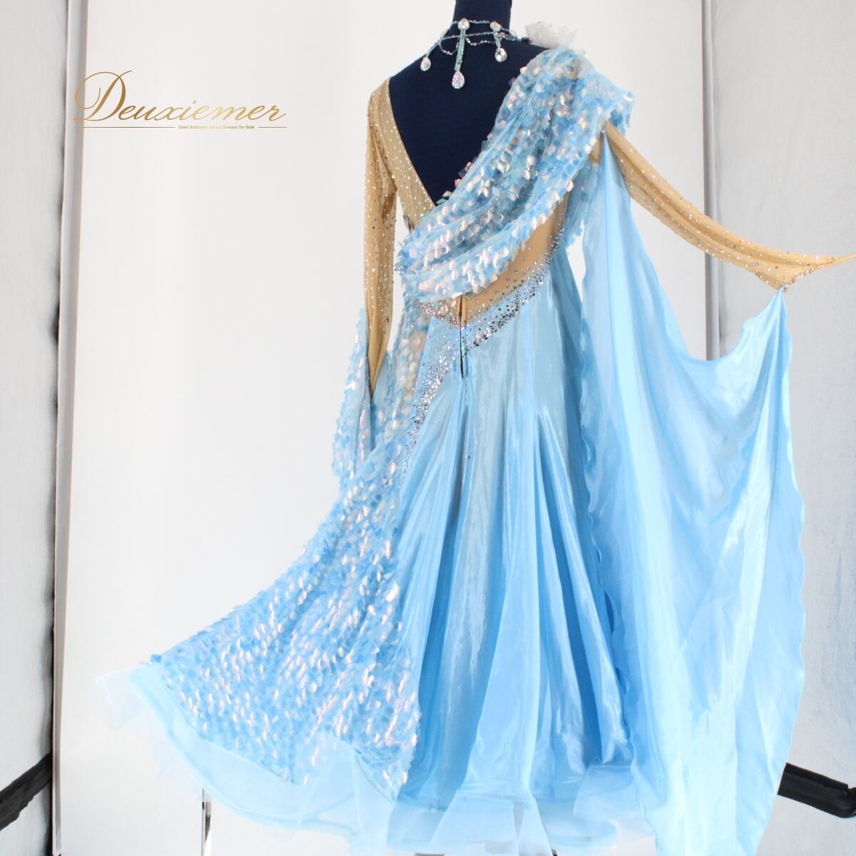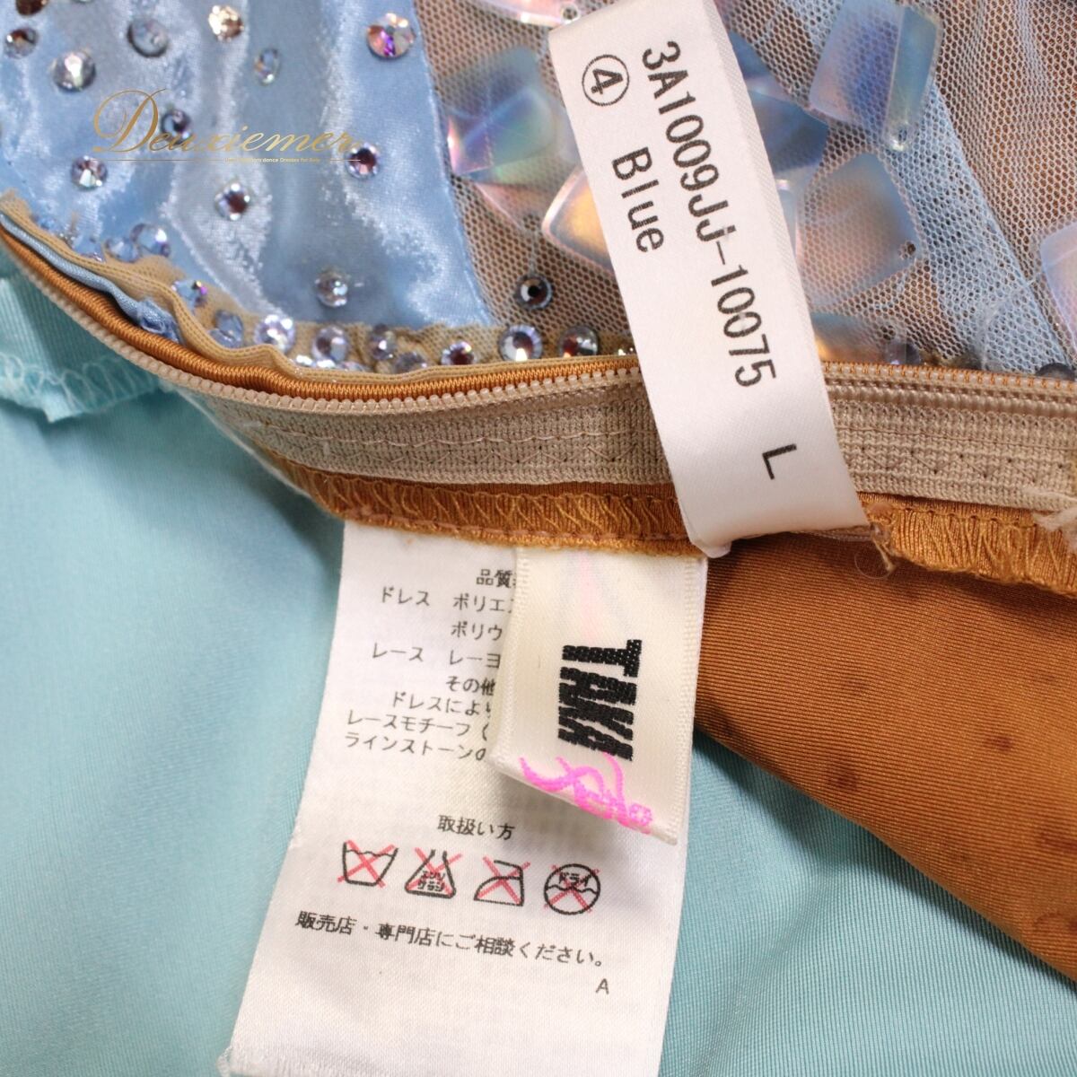 【社交ダンス衣装】ブルー系 TAKADANCE タカダンス ワンピース ドレス 水色 デモ 競技用 フロート 装飾 発表会 スカート 3枚重ね キラキラデザイン 鱗柄 胸パッド 脱着容易 レオタード 競技服 フォーマルダンス衣装 発表会用 社交ダンス用 踊り用 ドレス レディース おしゃれ 高級感