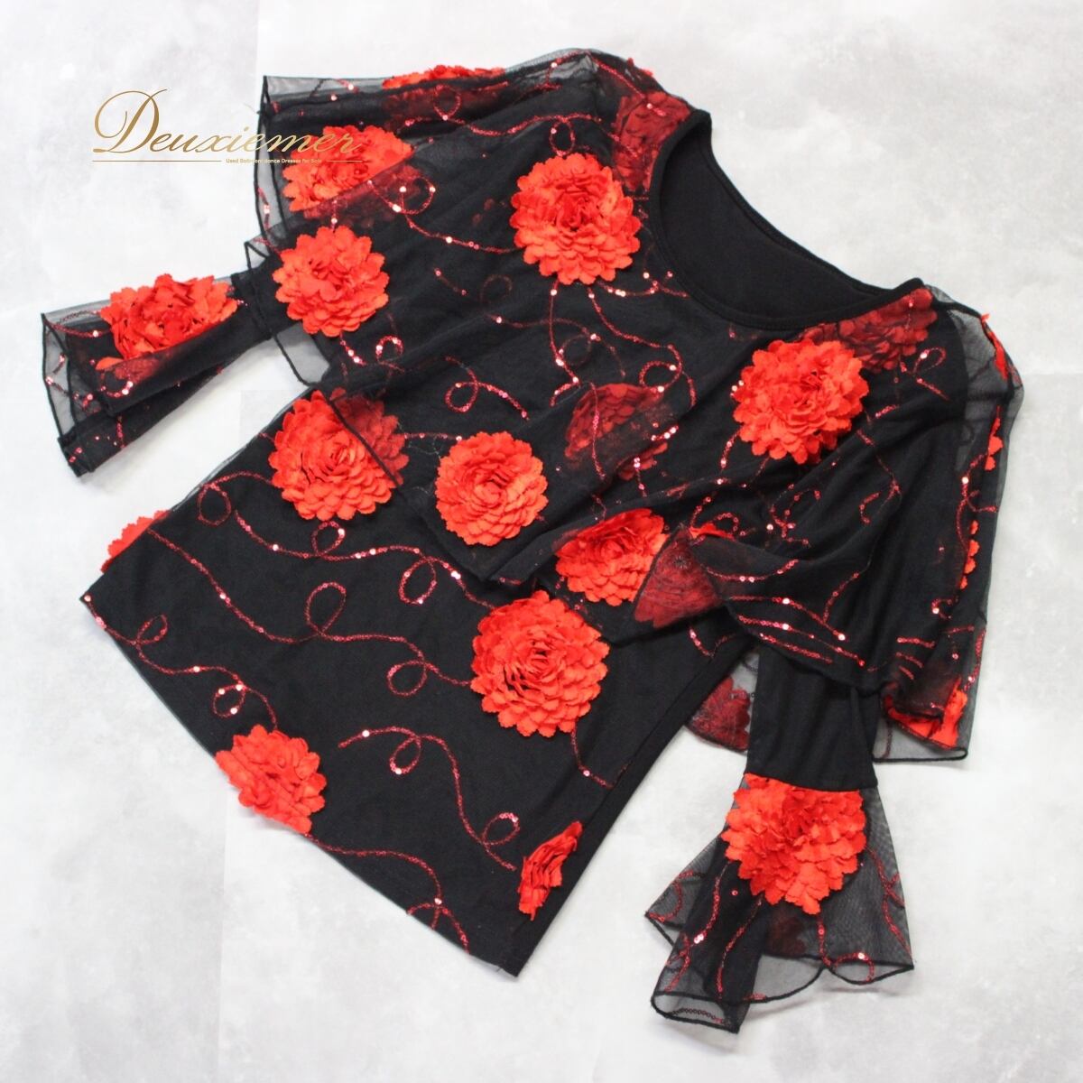 【美品 社交ダンス衣装】 レッド系 ブラック系 トップス ICHIOKU イチオク 赤 黒 スパンコール 花柄 ラバティンカラー 透け感