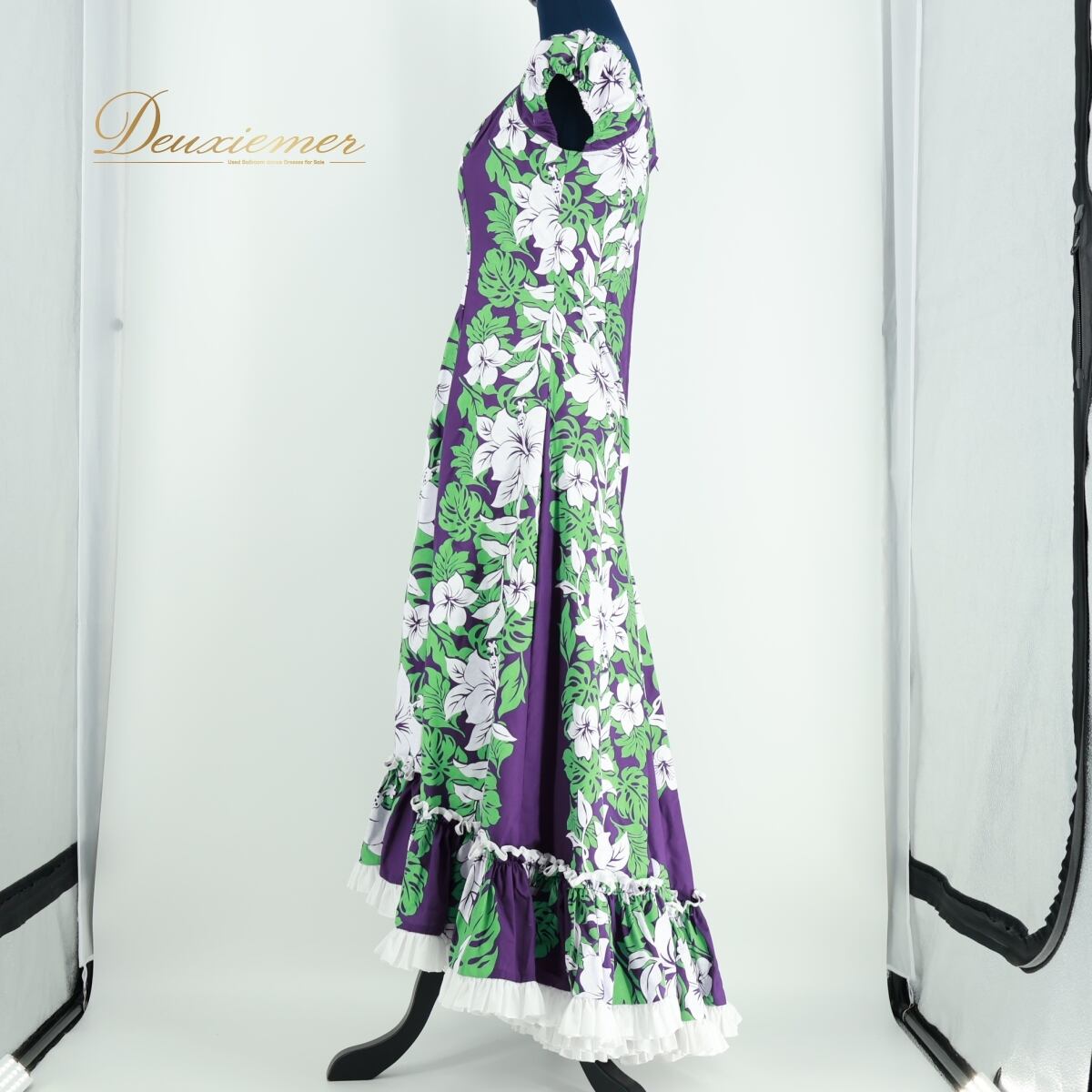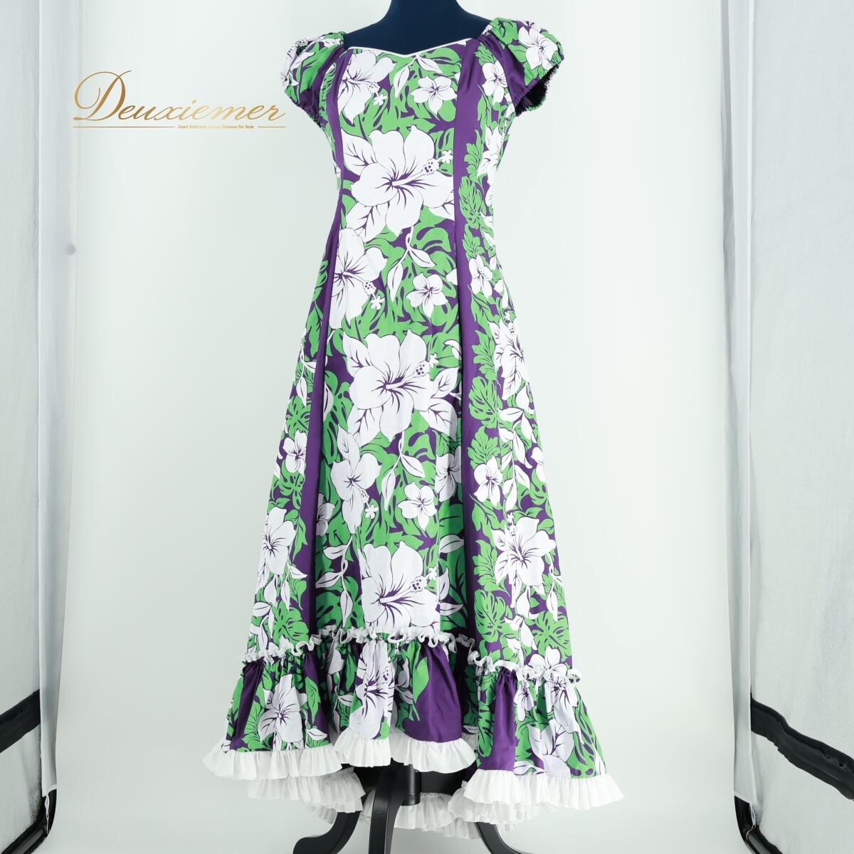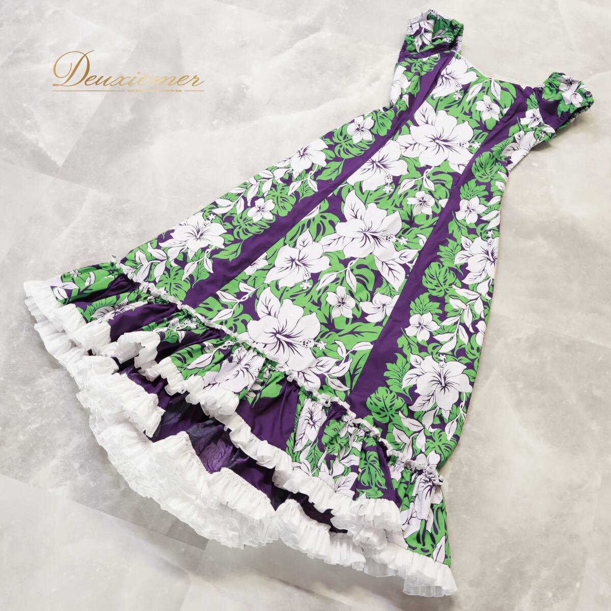 #フラダンス #衣装 #ワンピース #ドレス #HULA #ハイビスカス #パープル #ホワイト #グリーン #色鮮やか #ダンス衣装 #女性用トルソー #パーティー衣装 #特別な日 #フラダンス衣装 #ハワイアン #ビーチスタイル #リゾートファッション #華やか #ENUTSU