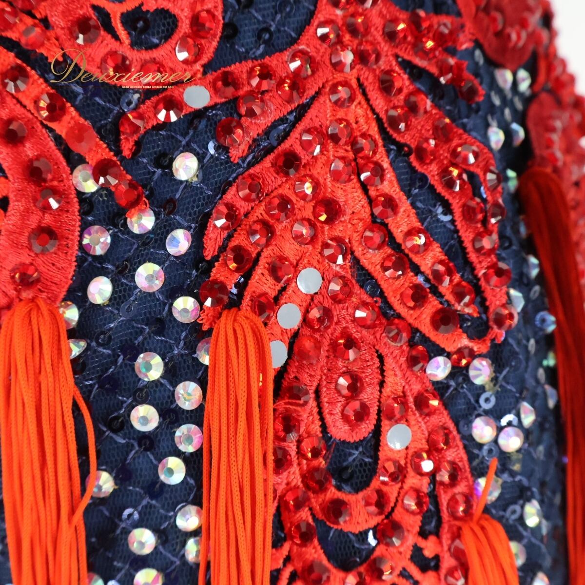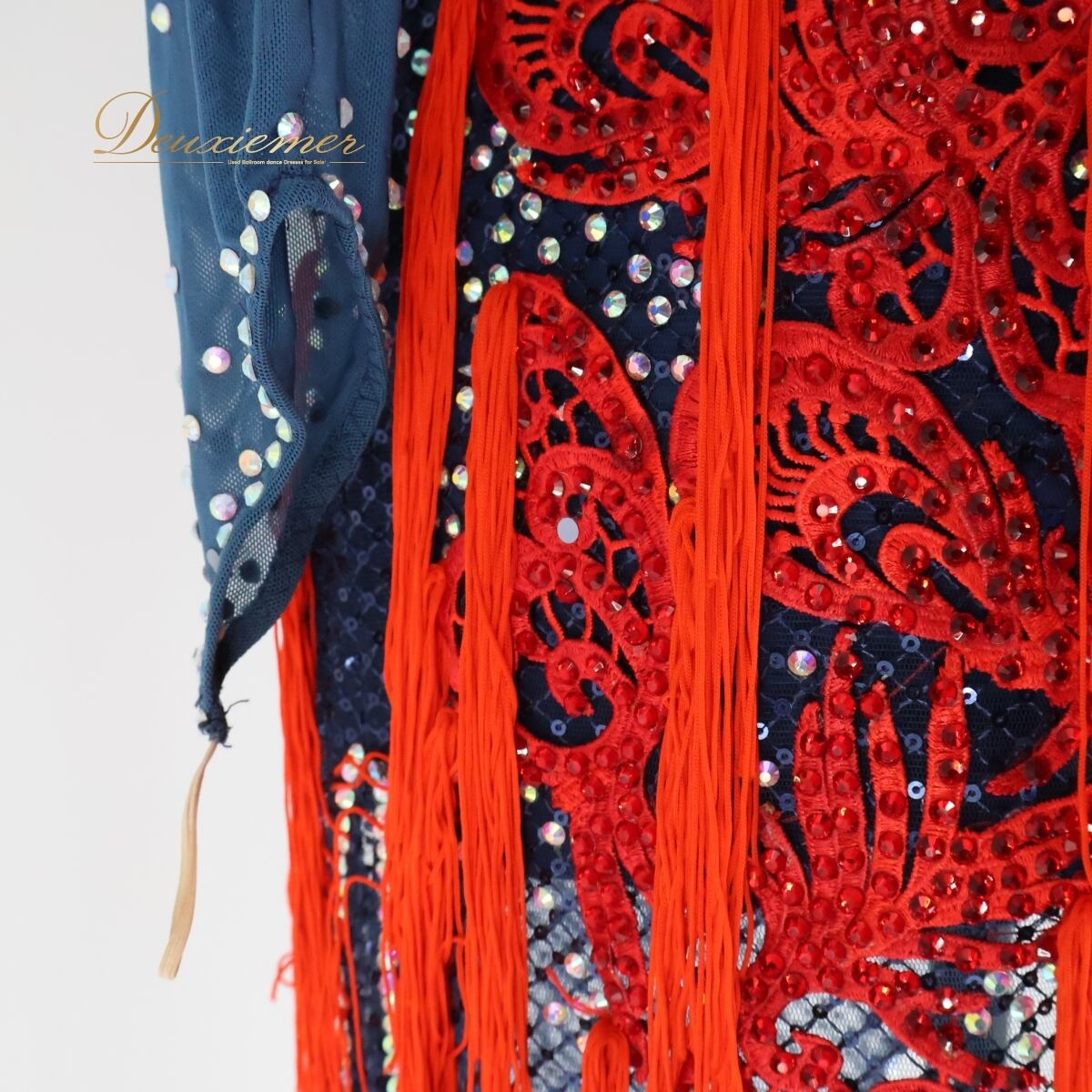 【社交ダンス衣装】ネイビー系 ラテン ドレス ワンピース 紺色 レッド 赤 上品 フリンジ メッシュ デモ 競技用 長袖 かっこいい 上品 ダンス フリンジ おしゃれ デザイン パーティー 競技 ダンス衣装 踊りやすい スタイリッシュ 女性用 コスチューム おすすめ 美しい ラテンスタイル グラデーション