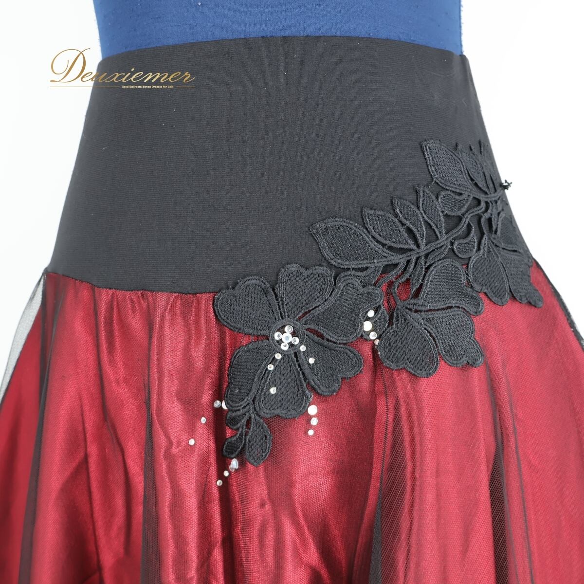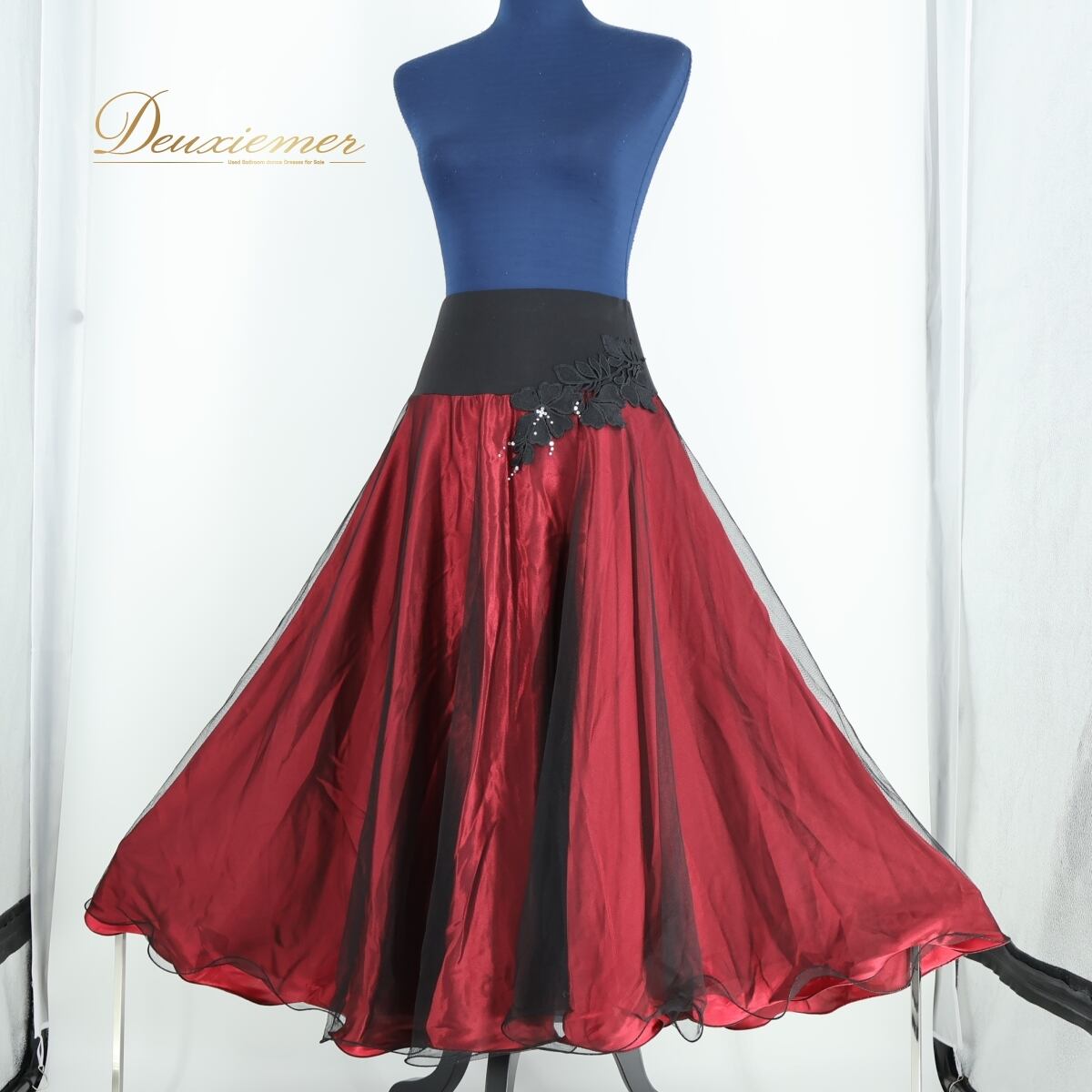 【社交ダンス衣装】レッド系 Roger スカート 赤 黒 花 透け感 光沢 レッスン 練習用 高級感 ふんわり ゴム 上品 ブラック系