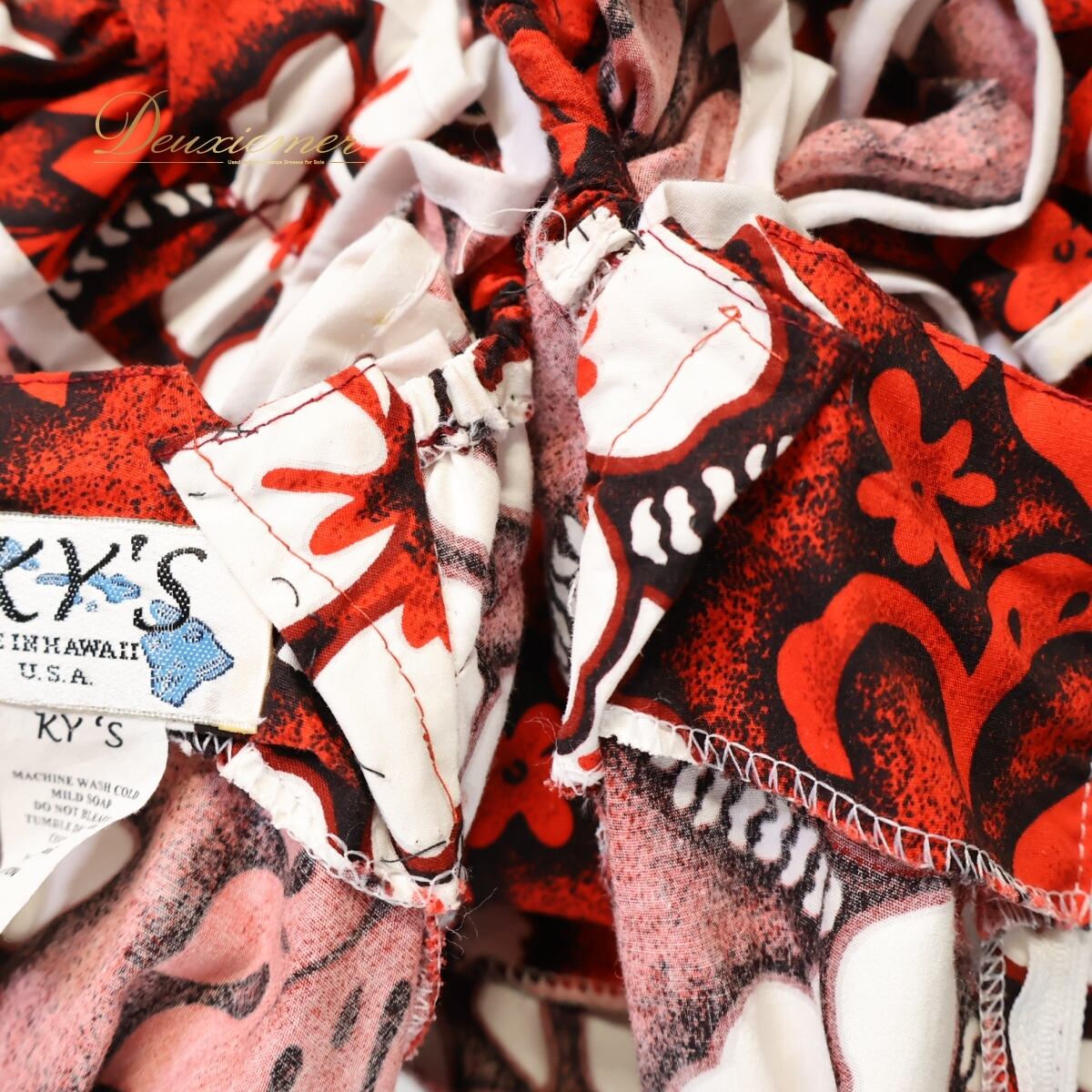 【ハワイ製 フラダンス衣装】レッド系 KY‘S ワンピース ドレス 赤 白 黒 ハイビスカス柄 花柄 鮮やか フリル ハワイアン