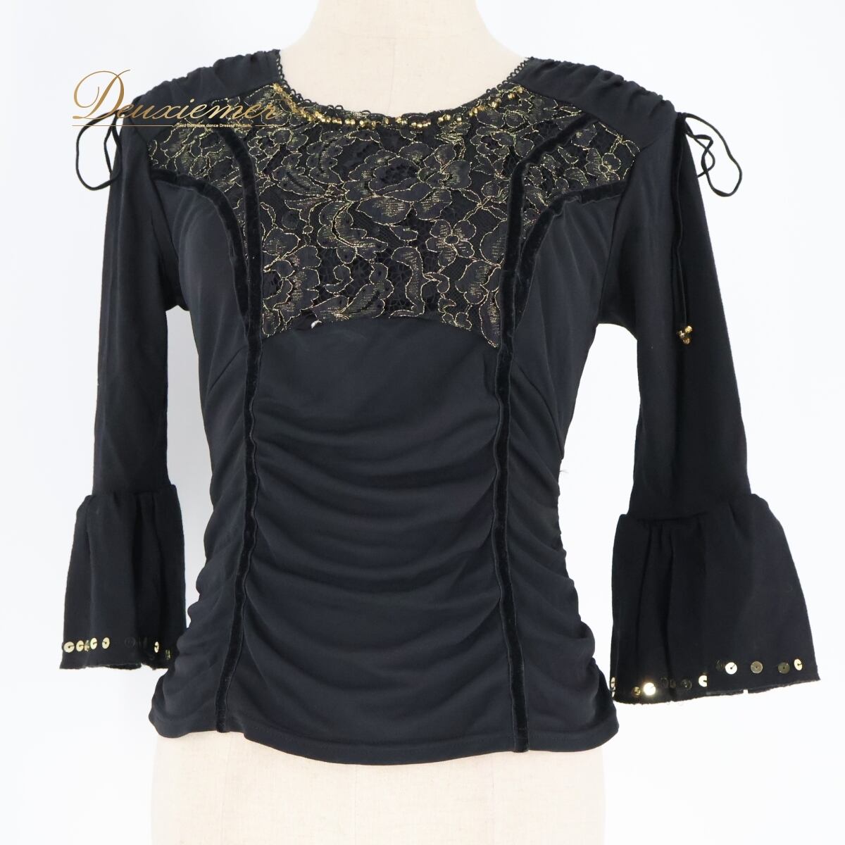 【日本製 社交ダンス衣装】ブラック系 Chacott チャコット ブラウス トップス 黒 金 リボン 花柄 レース 上品 レッスン パーティ 発表会 社交ダンス トップス おしゃれ レディース 伸縮性 ブラックブラウス 上品ブラウス パーティー衣装 レッスン用衣装 フォーマル 黒衣装 金アクセント 花模様 レースブラウス 丁寧なデザイン ブラックトップス Mサイズ