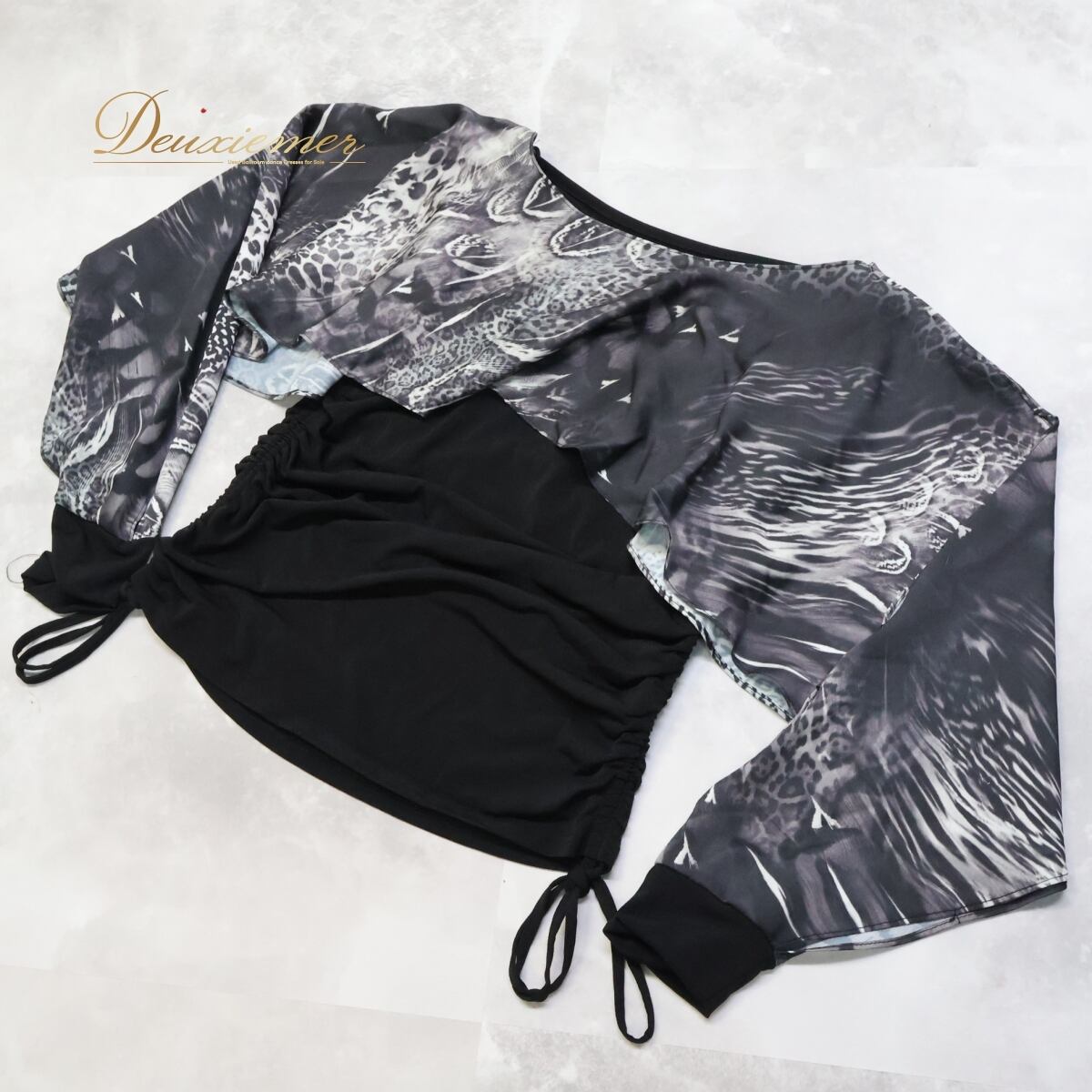 【社交ダンス衣装】ブラック系 create-sun クリエイトサン ブラウス トップス タンクトップ 黒 柄 アニマル柄 模様 レッスン 社交ダンス 衣装 レッスン用 パーティ用 軽い 袖付 トップス アニマルデザイン 伸縮性 タンクトップ風 体型カバー オシャレ フィット スタイリッシュ