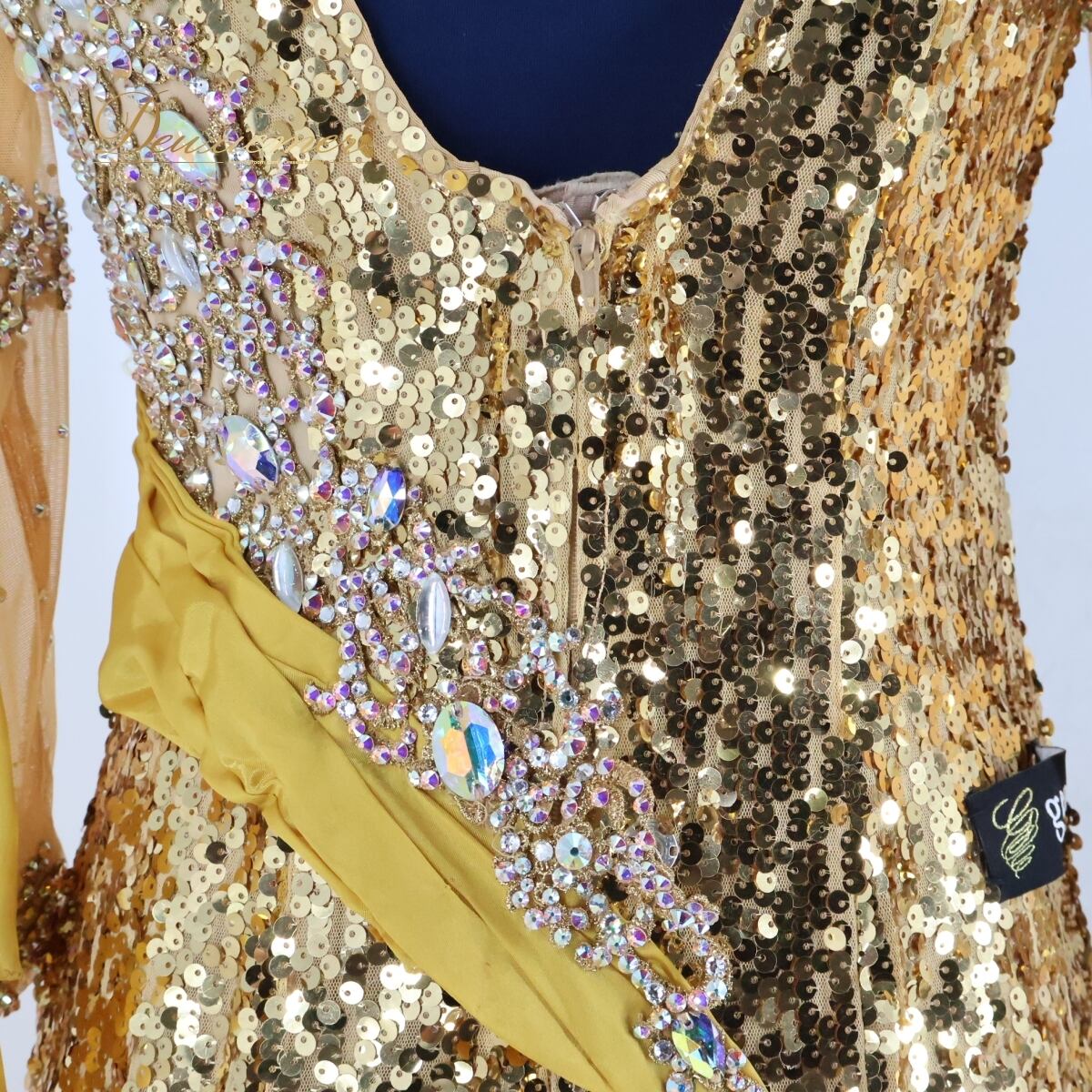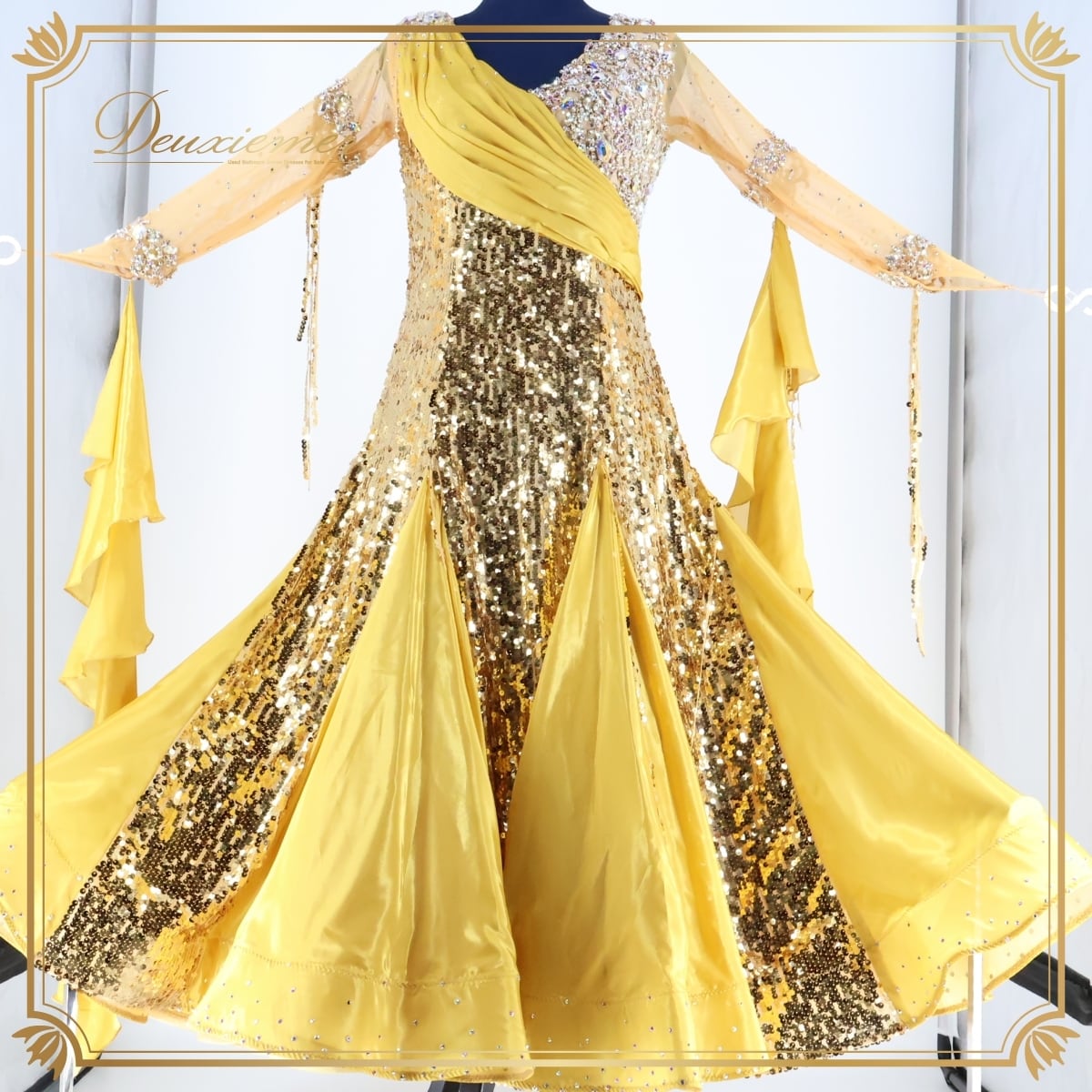 【社交ダンス衣装】イエロー系 gentil ジャンティ ワンピース ドレス 黄色 ゴールド スパンコール デモ 競技用 フロート フリル 社交ダンス ドレス イエロー パーティードレス スパンコール フロア映え デモ用 フリル付き 競技服 2枚重ね 丈約123cm 身幅約46cm ウエスト約36cm~ 光沢感 輝く衣装 華やか フェスティバル 伸縮性 ショーレディ ドレスアップ レディース