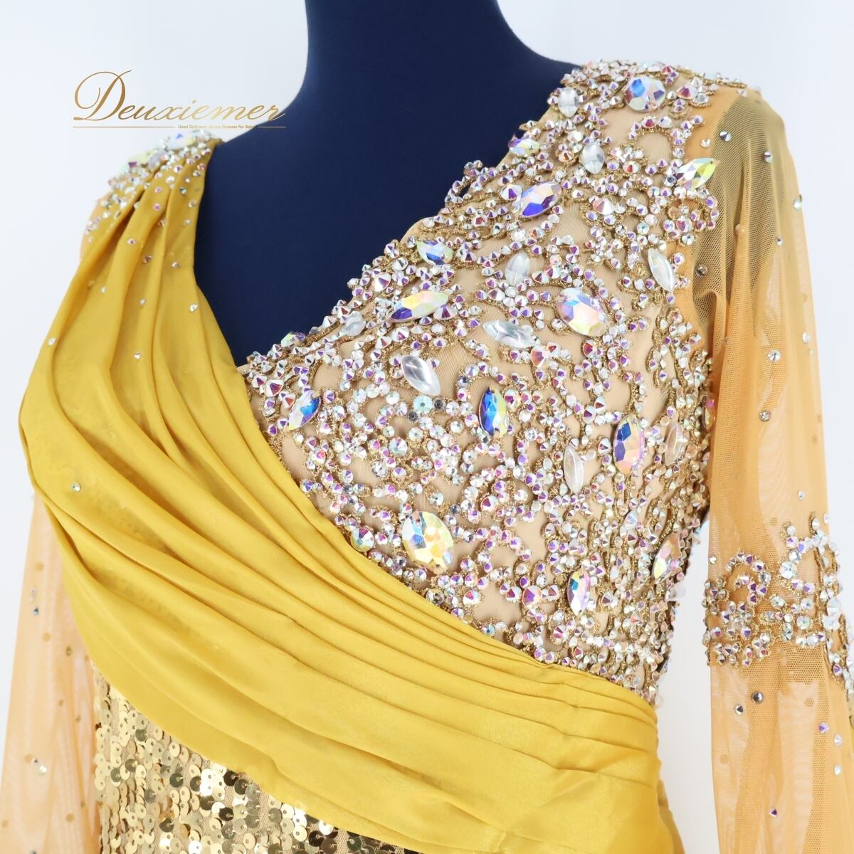 #社交ダンス #ダンス衣装 #ワンピース #ドレス #パーティードレス #イエローマスタード #スパンコール #フィット感 #レオタード #ファスナー #華やか #ダンスコーデ #おしゃれ #トルソー #女性用トルソー #イベント #ステージ衣装 #ダンスパフォーマンス #ドレスアップ #ENUTSU