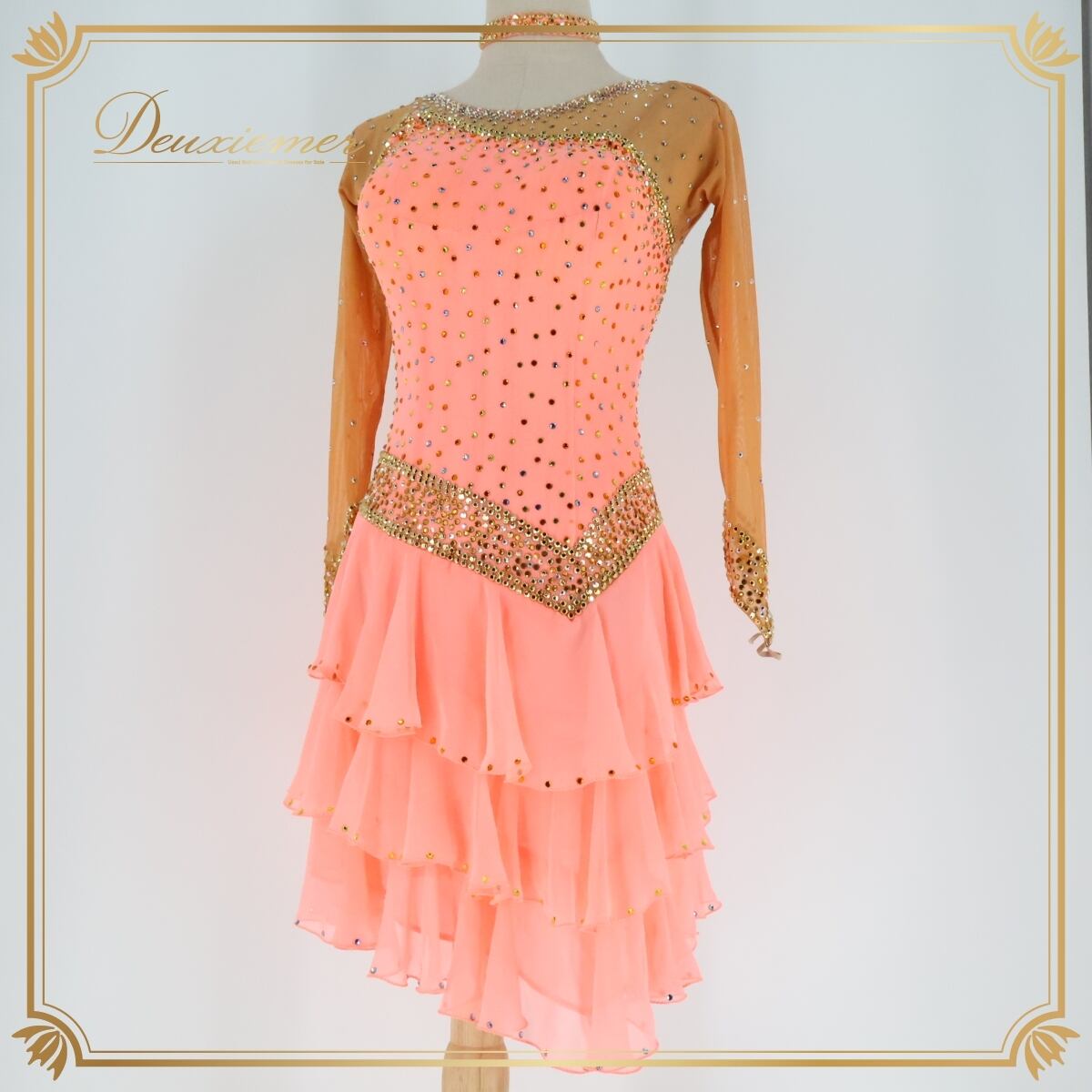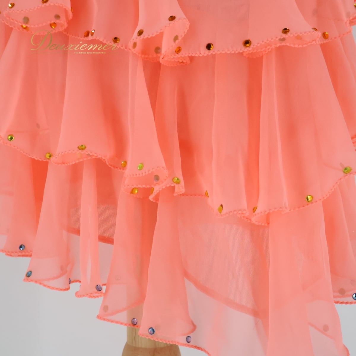 社交ダンス 衣装 ラテン ドレス ラテンドレス ワンピース 競技 ピンク系 サーモンピンク クロッチ レオタード デモ 競技会 ふんわり スカート 短め 明るい 色味 胸パッド 有り ショートスリーブ 競技用 ドレス ファスナー仕様 レオタードスタイル レディース ダンス衣装 芸能 発表会 余興