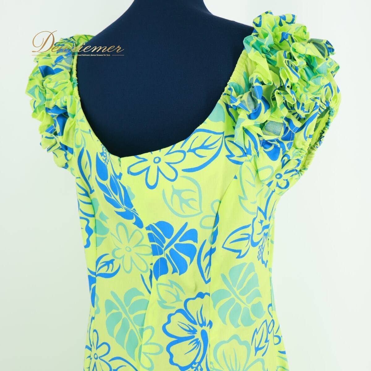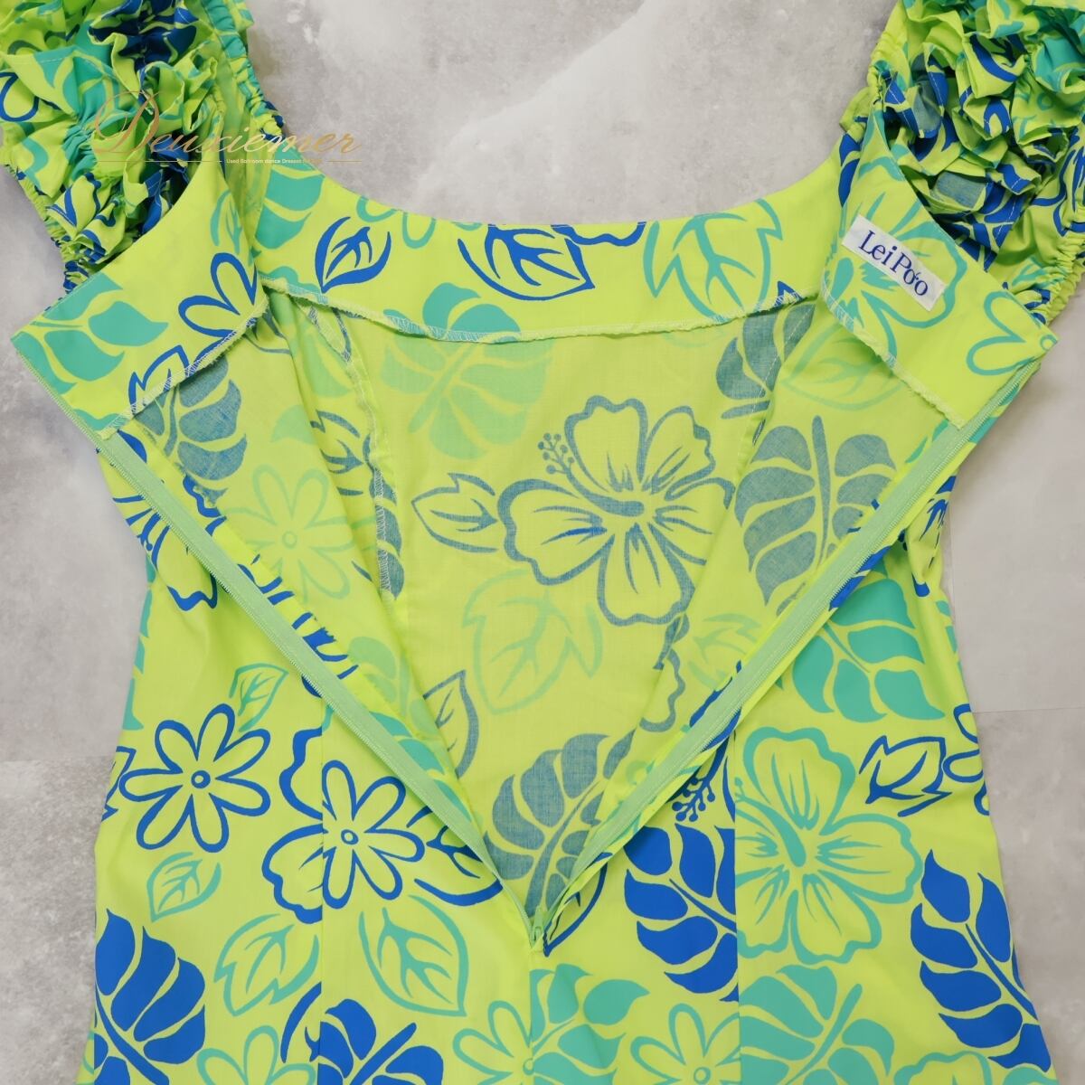 フラダンス 衣装 ワンピース ドレス グリーン系 フラ ダンス 黄緑 青 水色 Leipoo 花柄 ハワイアン アロハ フリル 爽やか 葉っぱ柄 ハイビスカス柄 淡い ブルー系