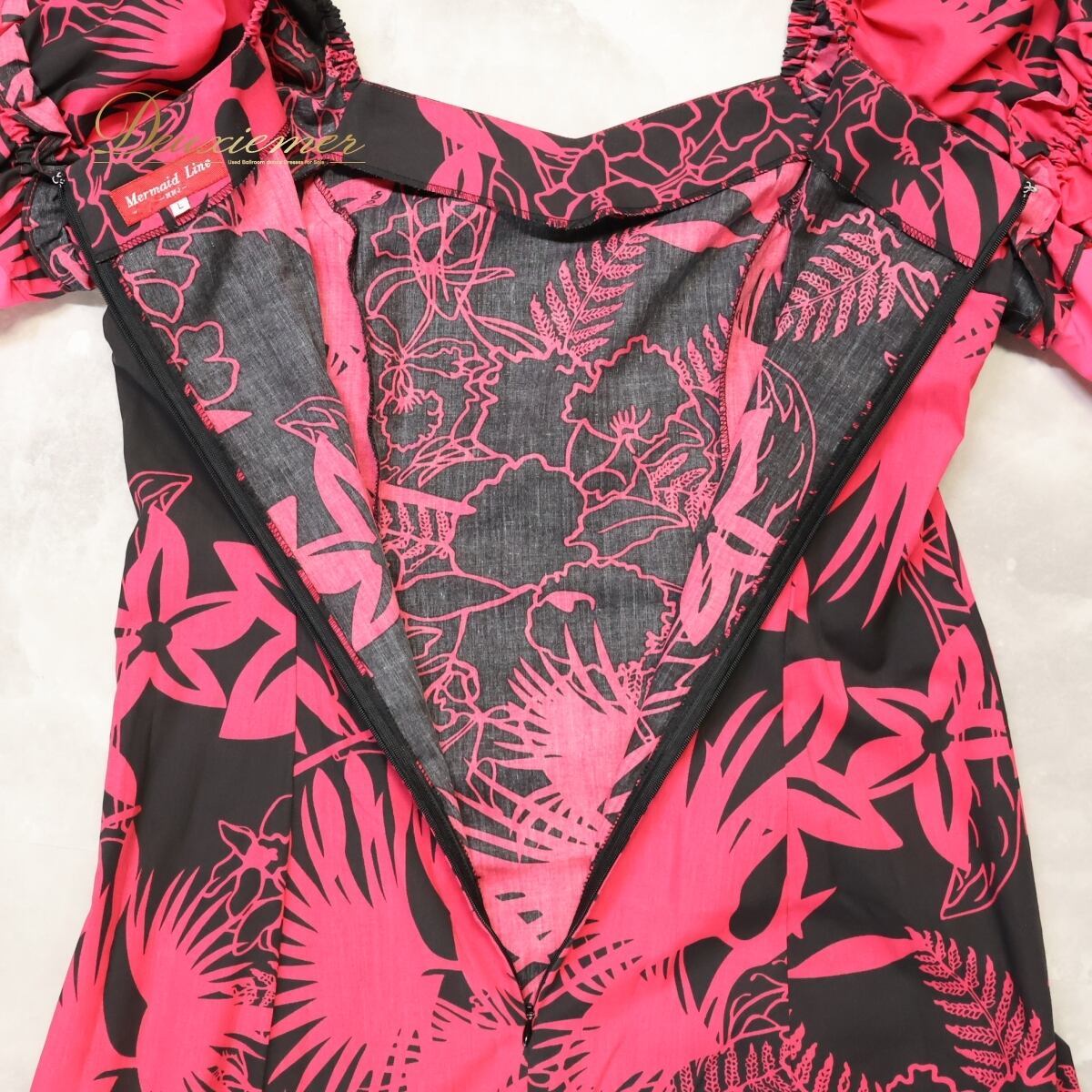 フラダンス 衣装 ワンピース ドレス ブラック系 マーメイドライン フラ ダンス 花柄 ハワイアン 鮮やか フリル MermaidLine MMJ 日本製 華やか ツートン アロハ ピンク系 ①