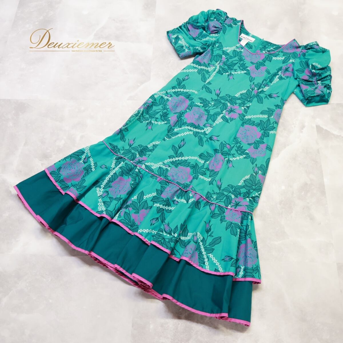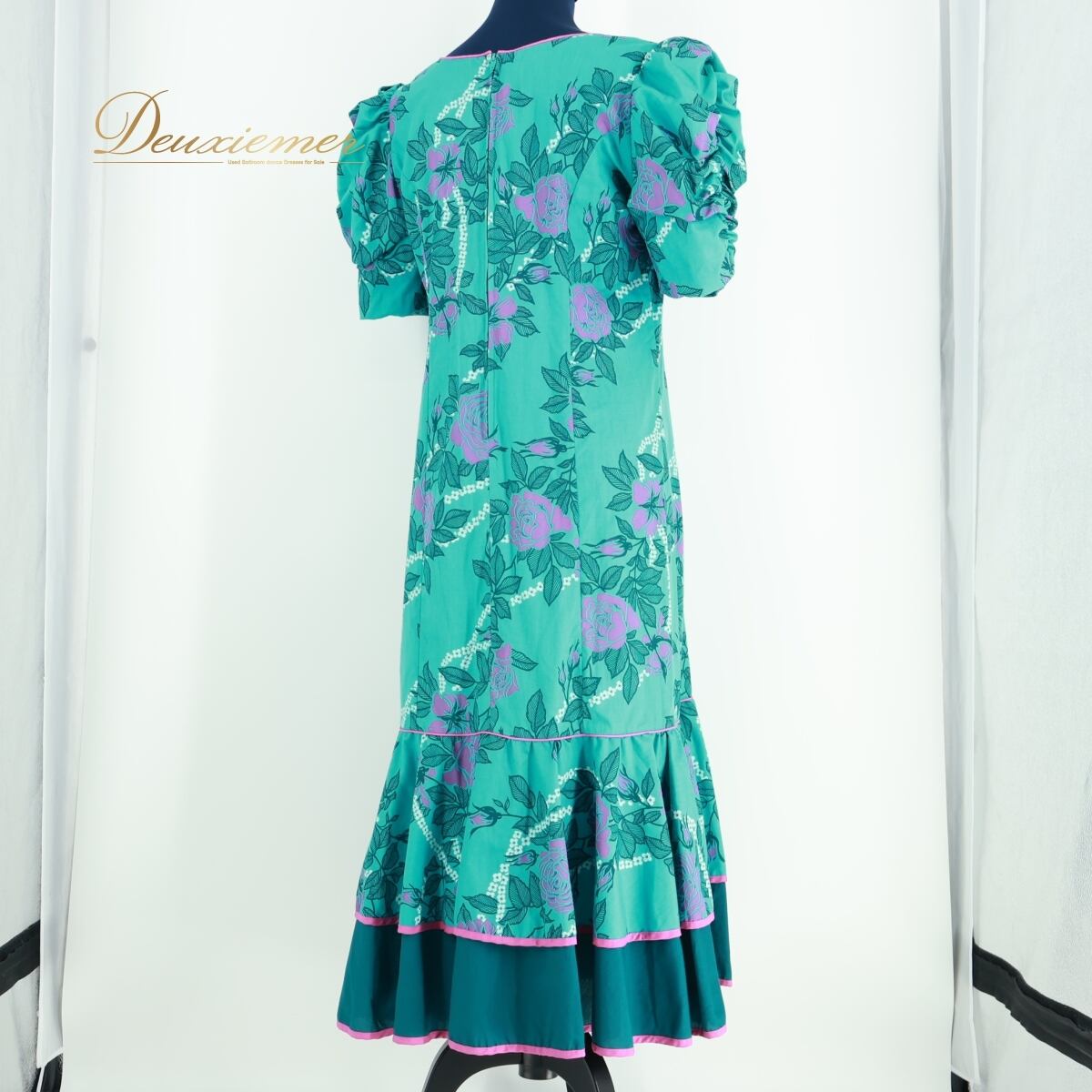 #フラダンス衣装 #ドレス #ワンピース #パフスリーブ #花柄 #グリーンパープル #ファッション #ビーチスタイル #リゾートファッション #ハワイアンスタイル #カジュアルコーデ #夏コーデ #レディースファッション #トルソー #ファッション通販 #おしゃれ #ウエストアクセント #ステージ衣装 #アロハ #ENUTSU