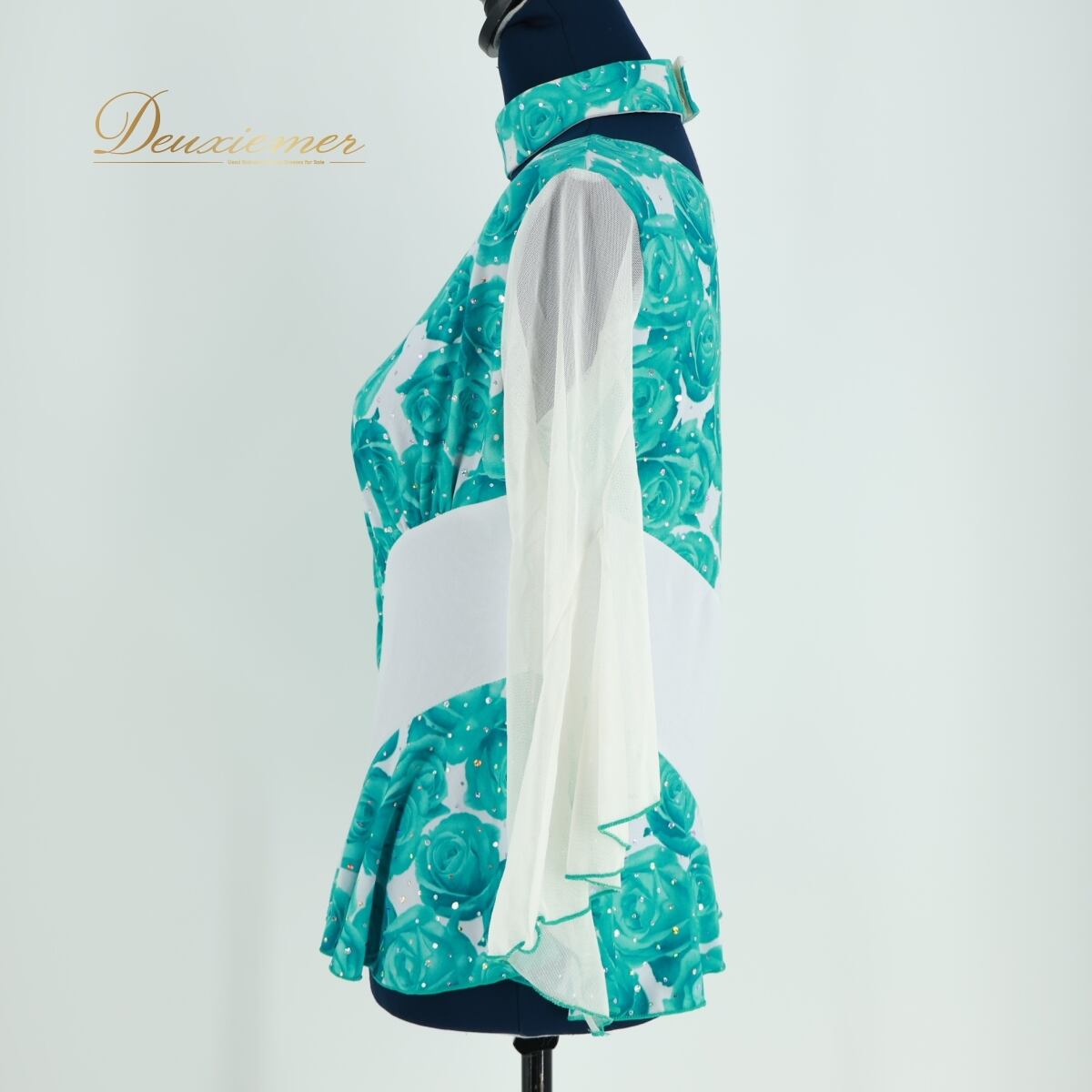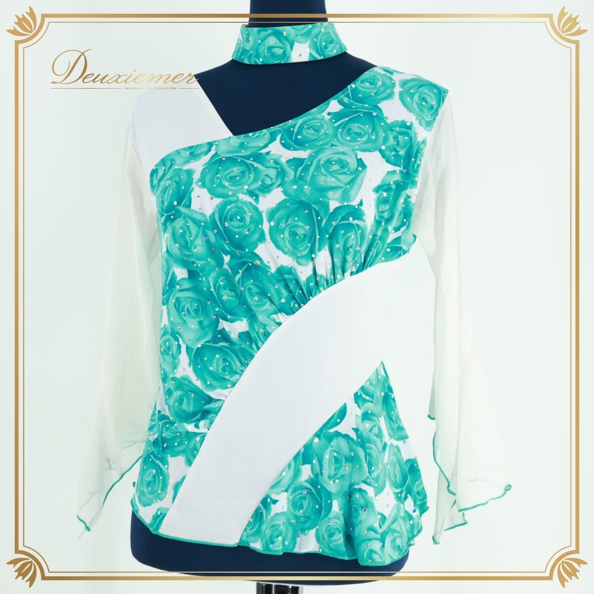 社交ダンス 衣装 スタンダード トップス ブラウス ホワイト系 ドニャヴィストーサ 白 緑 カットソー バラ柄 レッスン 伸縮 チョーカー セット Da Vistosa 透け感 練習着 華やか ストレッチ ホログラム 爽やか 明るい 長袖 グリーン系
