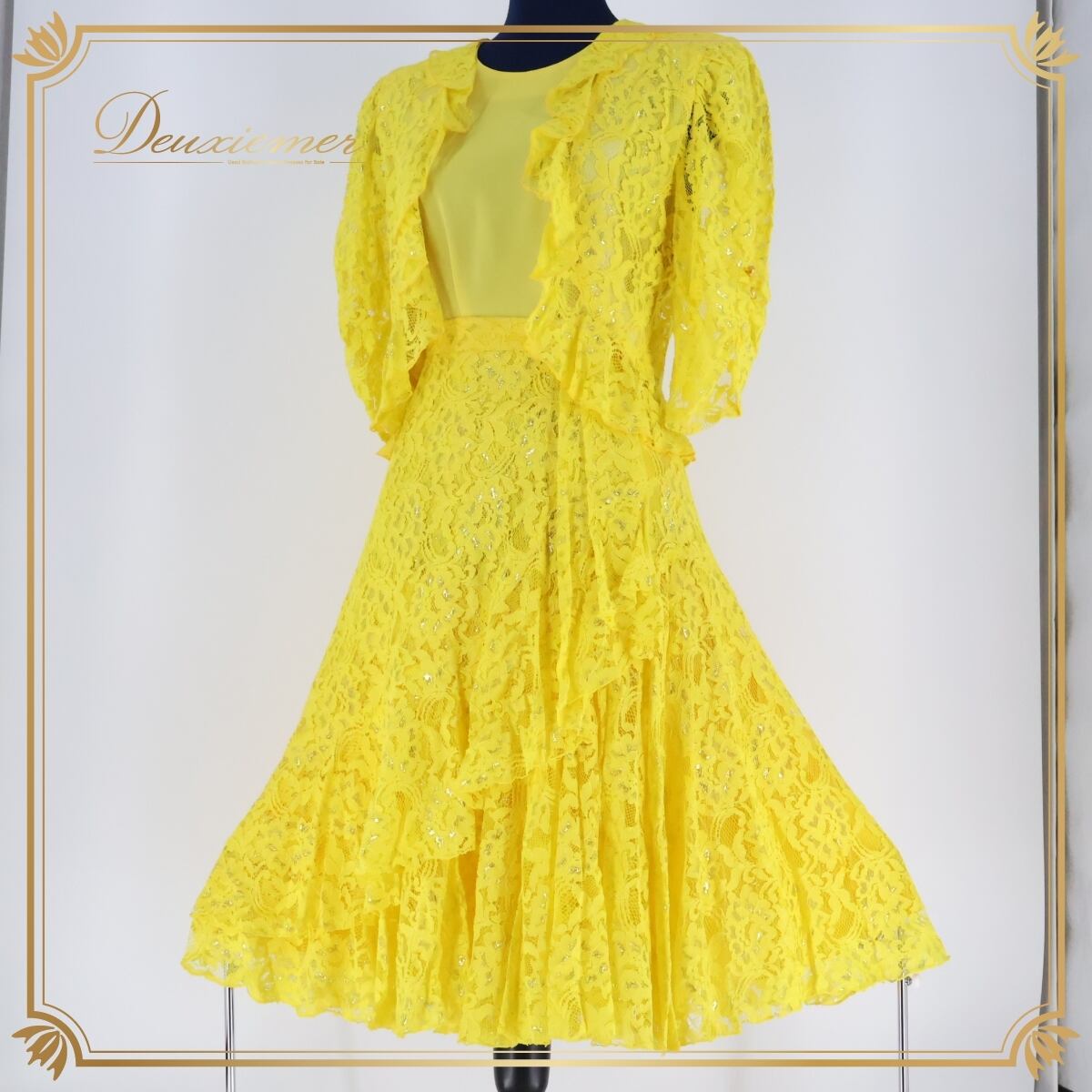 #社交ダンス #ダンス衣装 #ツーピース #ワンピースドレス #ダンスファッション #日本製 #鮮やかな黄色 #レース #花柄 #ファッション #舞台衣装 #ダンスイベント #女性用トルソー #ダンススタイル #衣装レンタル #セミフォーマル #カスタムサイズ #ダンスグッズ #ダンス小物 #パフォーマンス #ENUTSU