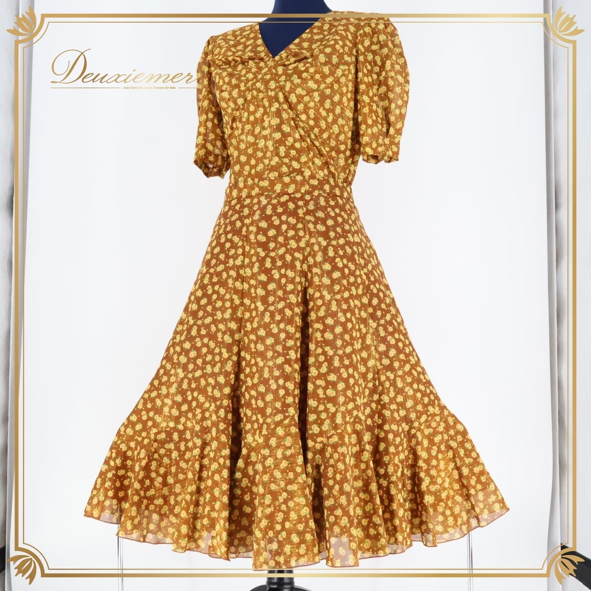 社交ダンス 衣装 ツーピース ワンピース ドレス 茶色 花柄 レッスン 練習着 日本製 ブラウン系 ゴールド系 イエロー系 イエロー系 イベント フレアスカート おしゃれ ダンス用品 大人用 ファッション かわいい フォーマル カジュアル デザイン
