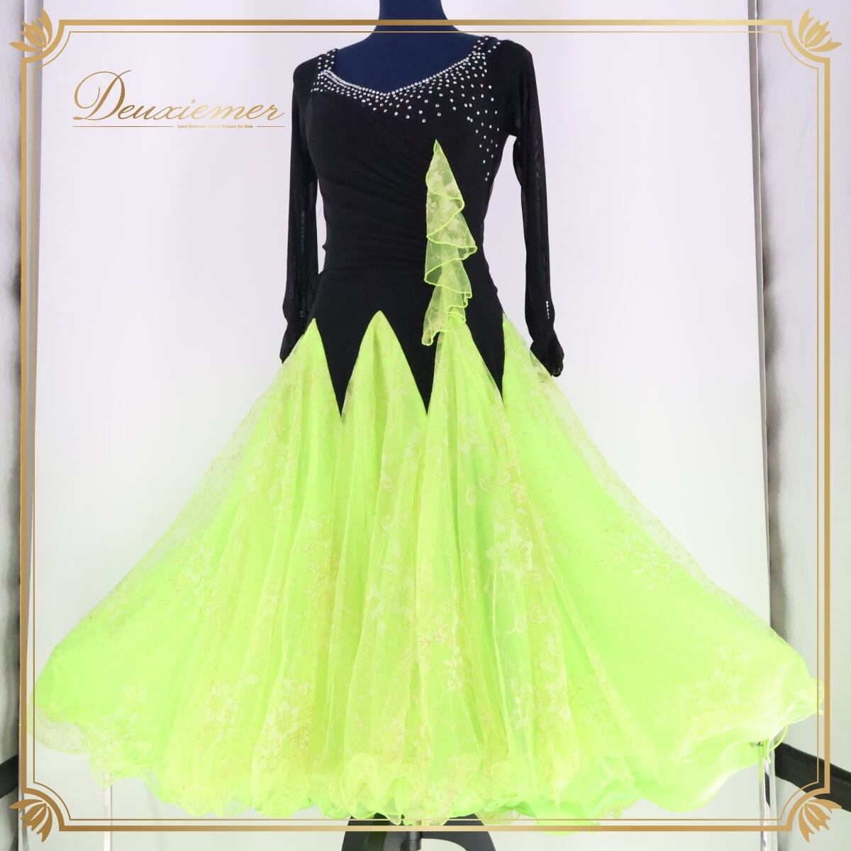 社交ダンス 衣装 スタンダード スタンダードドレス 社交ダンスドレス ワンピース ドレス 黄緑 競技 デモ グリーン系 緑 黒 ブラック 蛍光 蛍光黄緑 競技用ドレス フレアスカート 伸縮性 ワンピースドレス 発表会 ダンス衣装 体型カバー おしゃれ レディース Lサイズ ステージ衣装