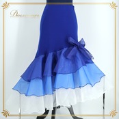 社交ダンス 衣装 スタンダード スカート ブルー系 Roger 青 白 スタンダードスカート 3段 フリル リボン オーガンジー 透け感 鮮やか アシンメトリー ふんわり ボリューム 上品 ホワイト系 レッスン 練習着