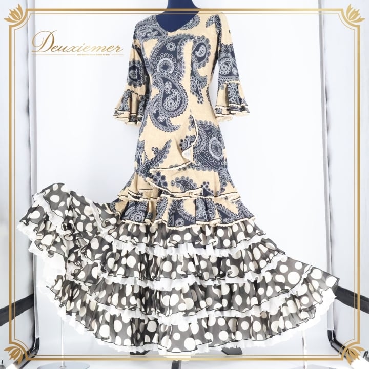 #フラメンコ #衣装 #ワンピース #ドレス #ソニアジョーンズ #アイボリーゴールド #段々ボランテ #華やか #背面ファスナー #パーティードレス #フォーマル #ダンス衣装 #女性用トルソー #スタイルアップ #ファッション #コーディネート #エレガント #特別な日 #イベント #ENUTSU